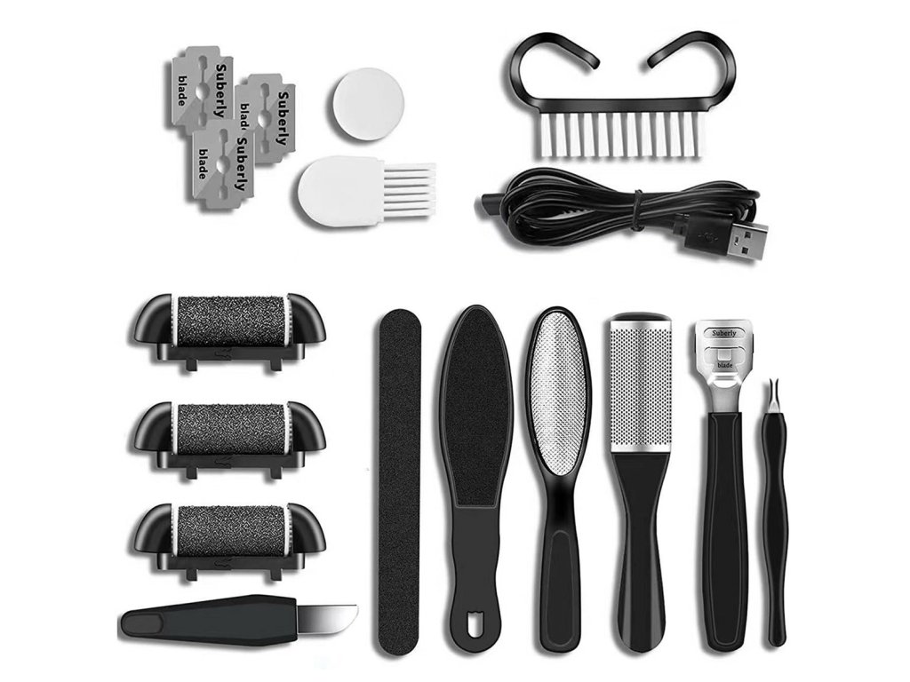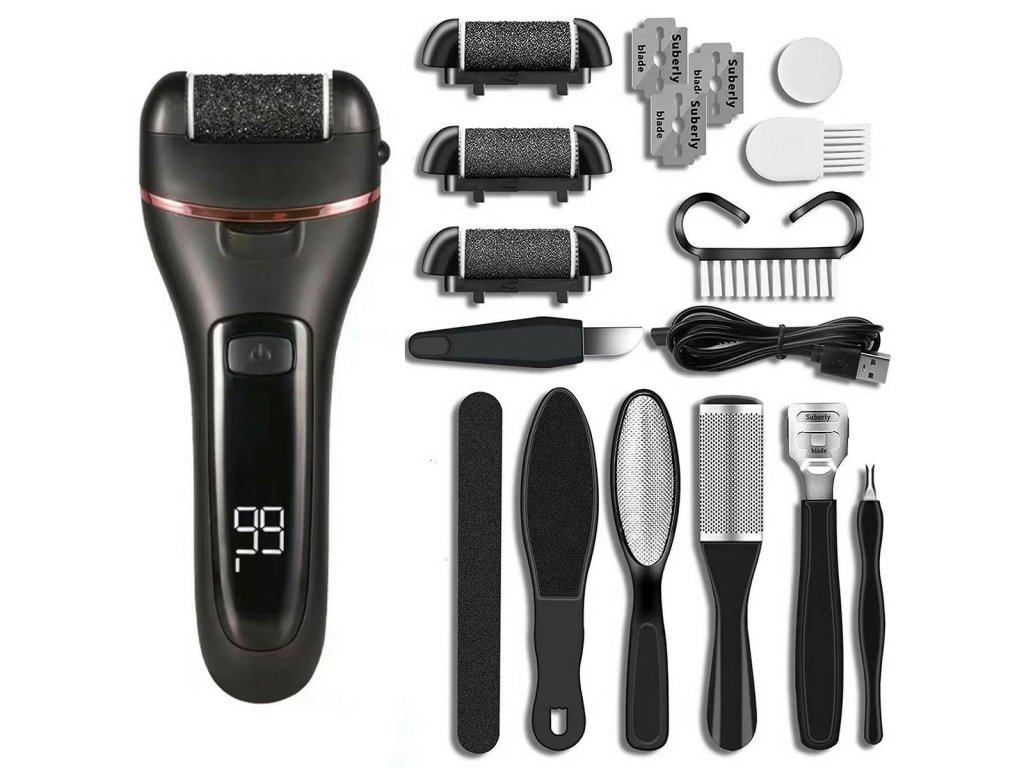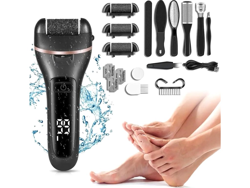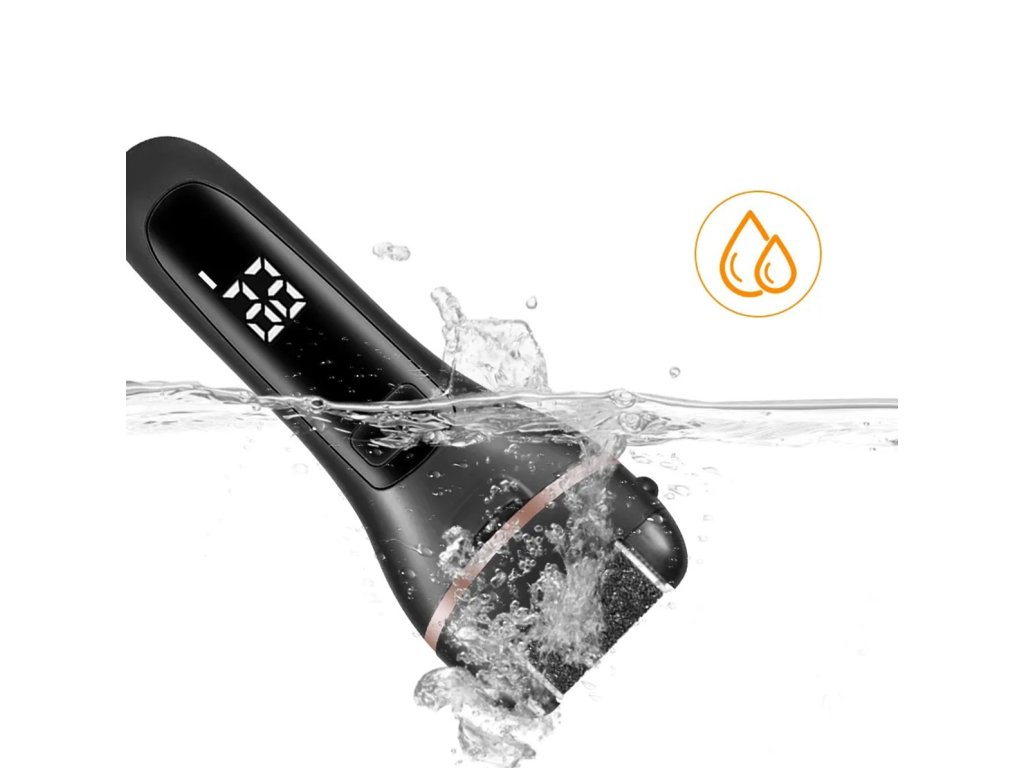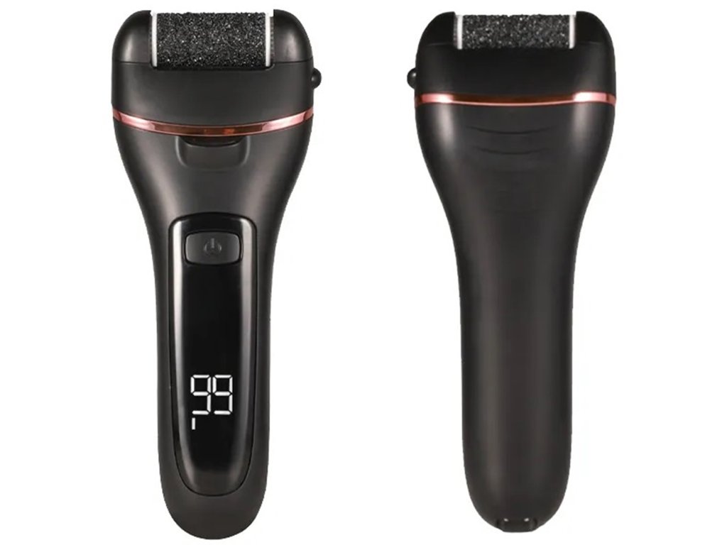 Elektrická bruska na paty. Určena k odstraňování přebytečných zrohovatělých tkání z chodidel. Je vybavena vestavěnou baterií, LED světlem a přehledným LCD displejem, takže se snadno používá. Štíhlý a kompaktní design zajišťuje bezpečný úchop během používání a minimalizuje únavu rukou. Sada obsahuje tři hlavice s různou zrnitostí (dvě hrubé a jednu jemnou) a řadu dalšího příslušenství, jako jsou kartáče a pilníky pro detailnější péči.