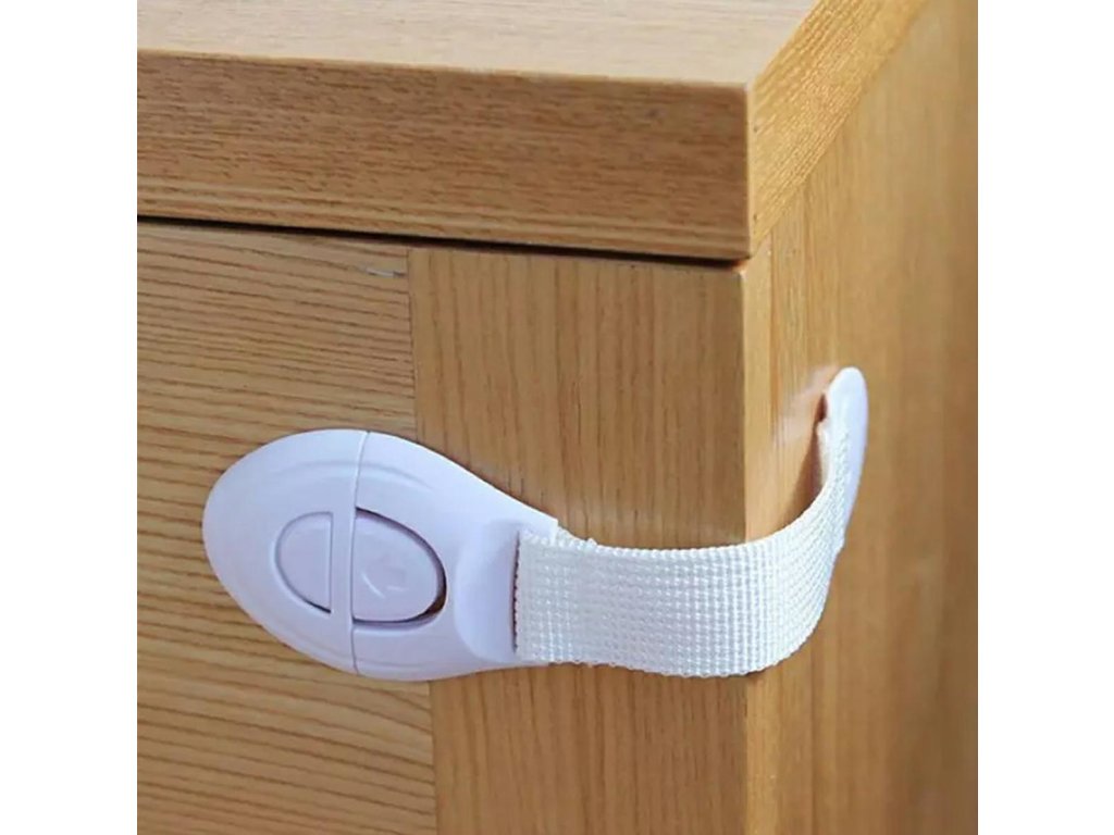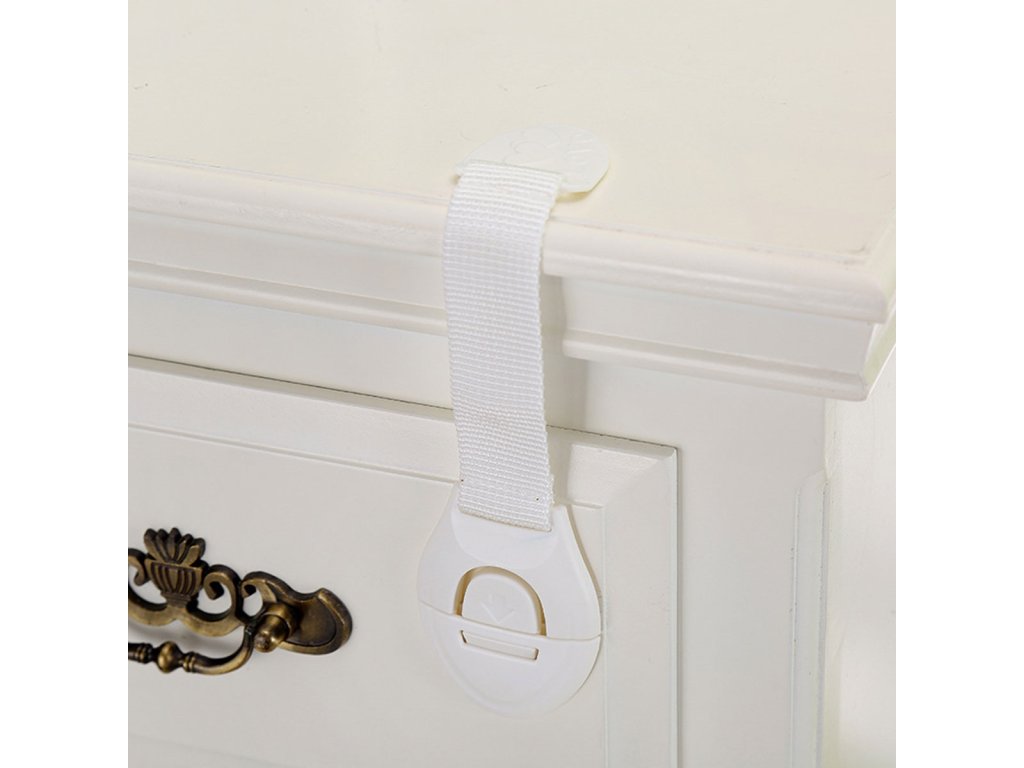 Zajištění skříněk a zásuvek proti otevření malými dětmi. Má flexibilní konektor, který umožňuje přilepit ochranu kamkoli pomocí oboustranné pásky. Zámek pevně drží na jakémkoli povrchu.
