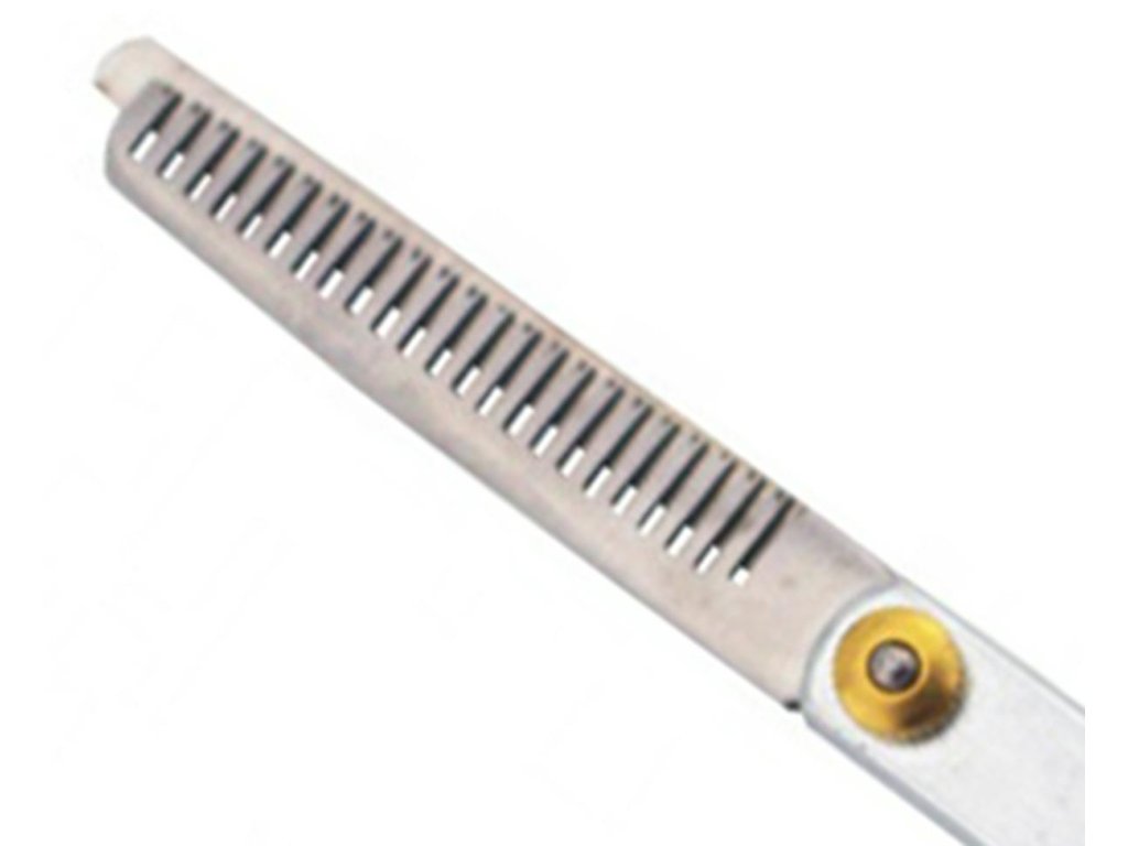 Ergonomické efilační kadeřnické nůžky vyrobené z nerezové oceli. Jsou ideální pro profesionální použití i pro amatérské stříhání vlasů. Čepel nůžek má speciální šroub pro nastavení vůle. Gumová zarážka mezi prsty zajišťuje tichý chod. Dodatečná opěrka prstů zvyšuje přesnost řezání a snižuje únavu rukou.