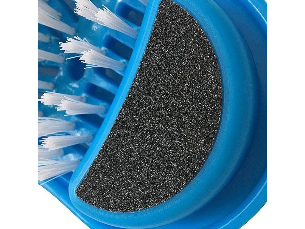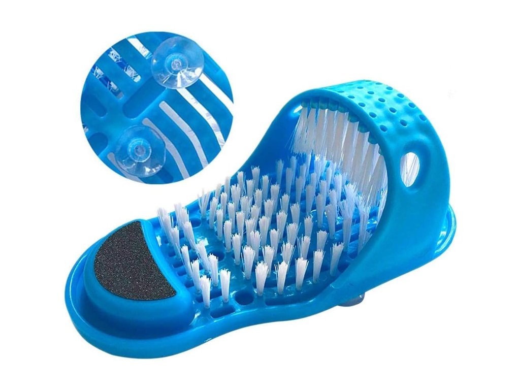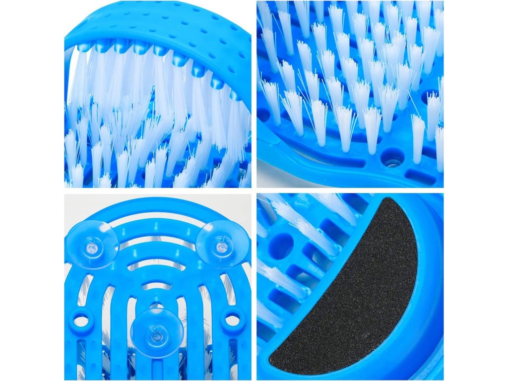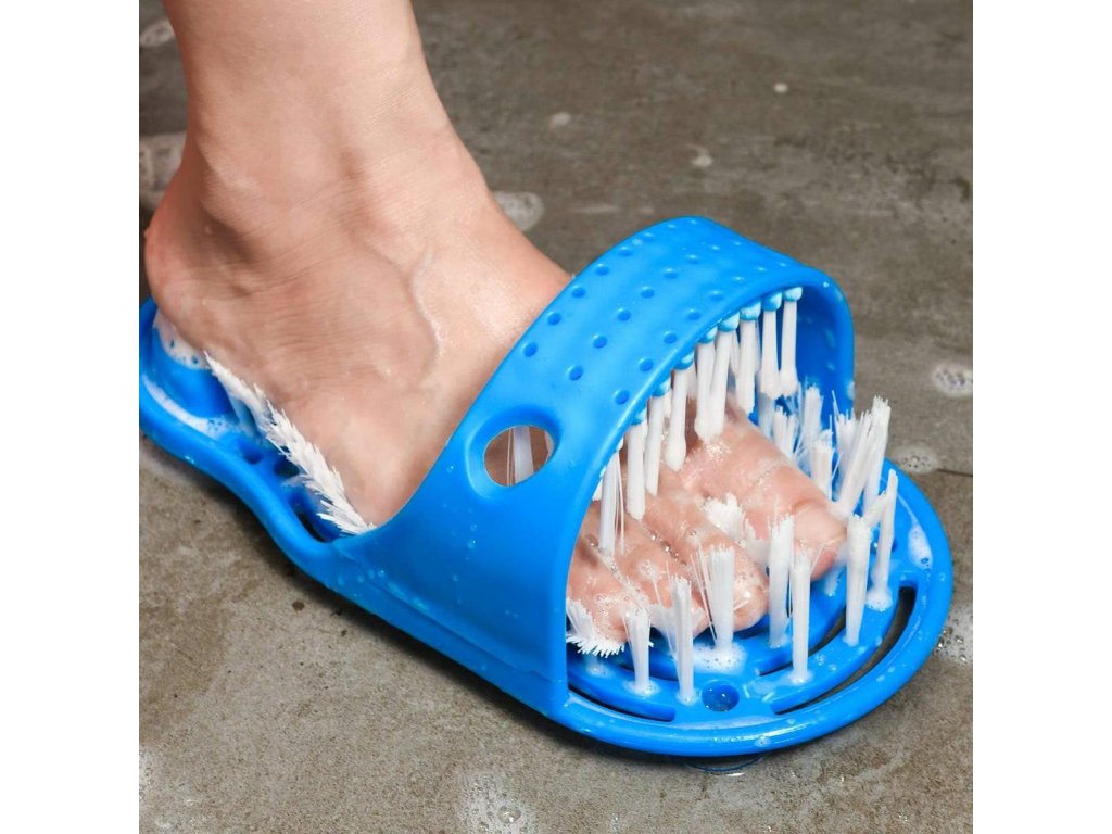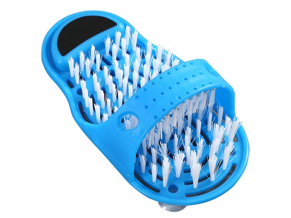 Kartáč na nohy vybavený pemzou pro drhnutí pat. Nosí se jako klasické žabky a umožňují pohodlnou péči o nohy při koupání. Husté a jemné štětiny dokonale masírují chodidlo a smývají nečistoty. Speciální přísavky na spodní straně zabraňují uklouznutí ve sprše.