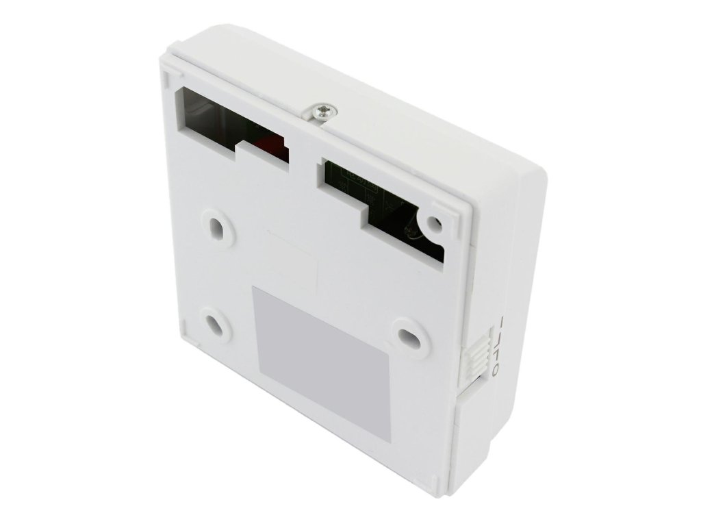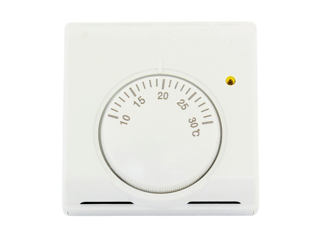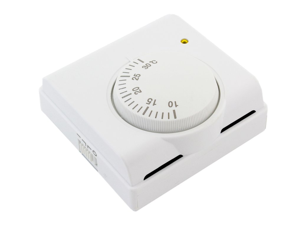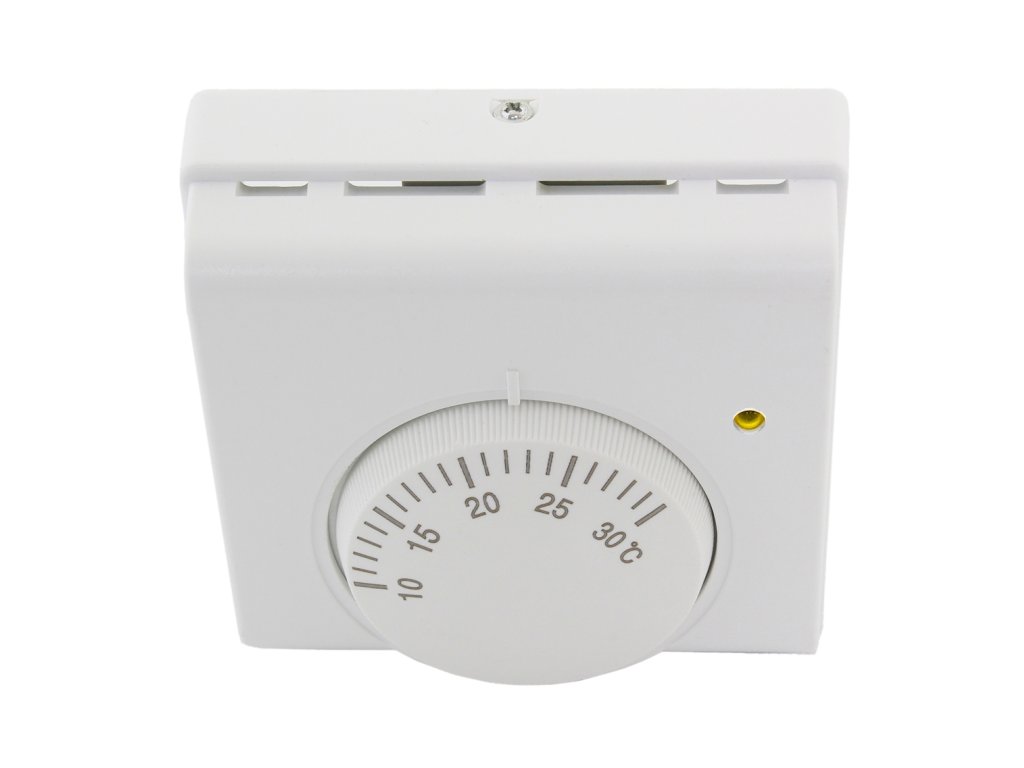 Pokojový termostat, regulátor teploty. Vybaveno praktickým mechanickým knoflíkem pro regulaci teploty a indikační diodou (provozní režim). Snadná instalace a jednoduché ovládání (velký knoflík). Umožňuje nastavit teplotu od 10 stupňů do 30 stupňů Celsia. Termostat umožňuje ovládat vytápění (zapnutí oběhového čerpadla) nebo chlazení (zapnutí ventilátoru). Výrobek určený pro vnitřní použití.