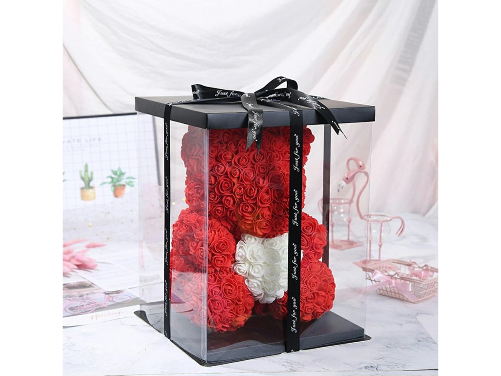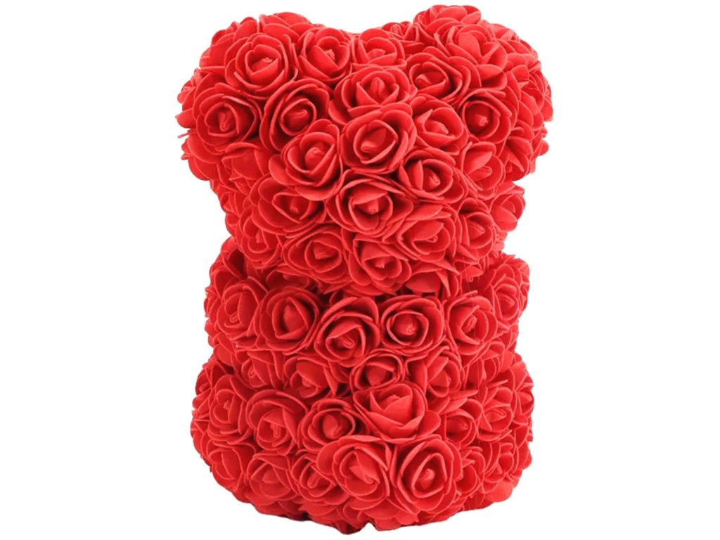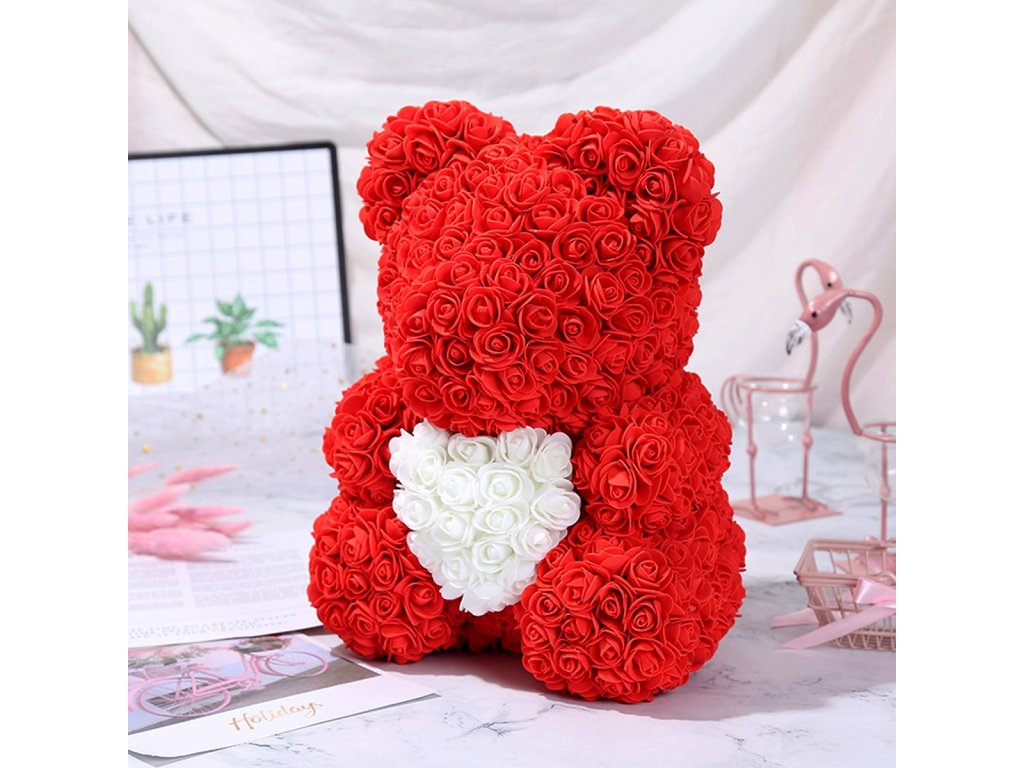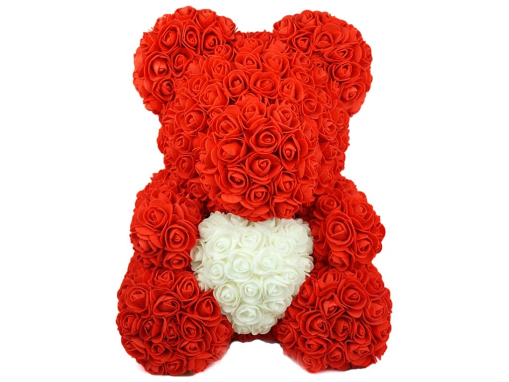 - Medvídek z červených růží držící bílé srdce.
