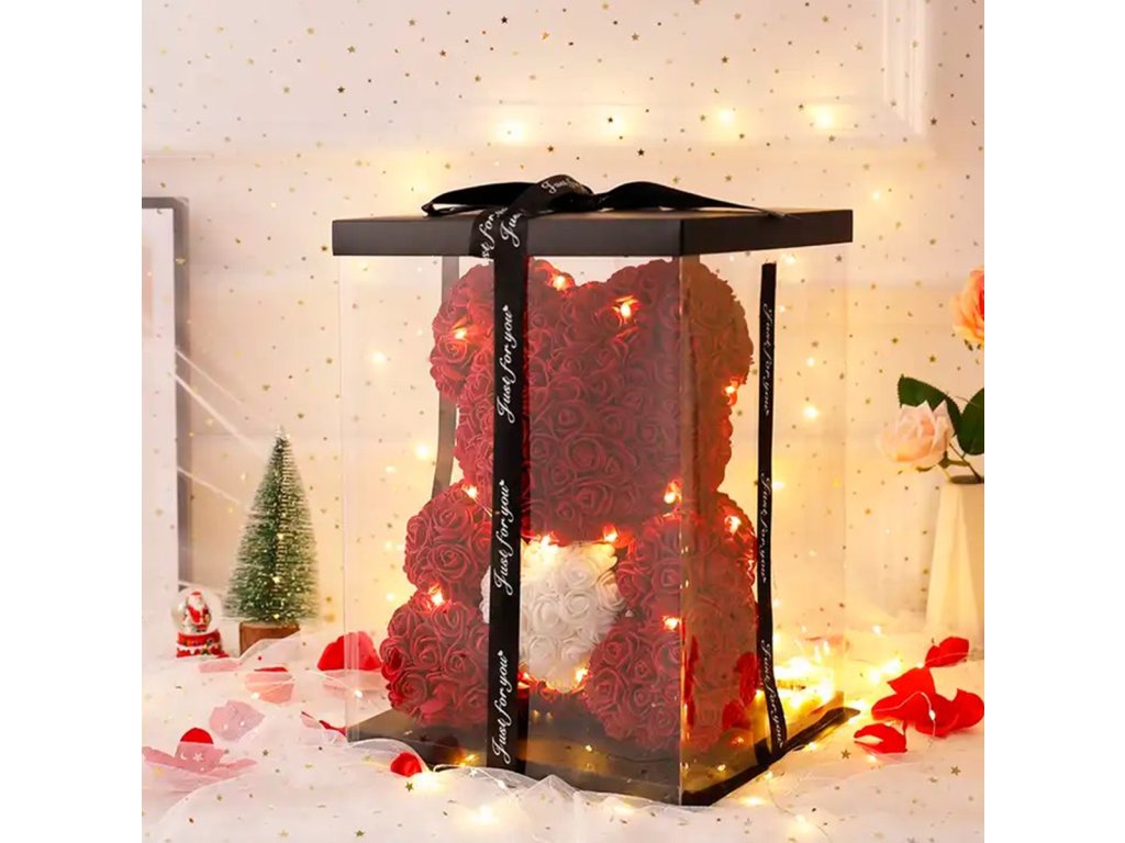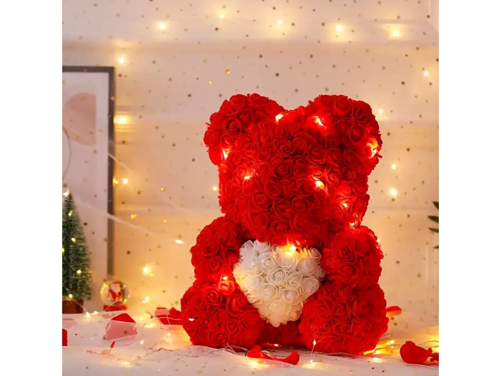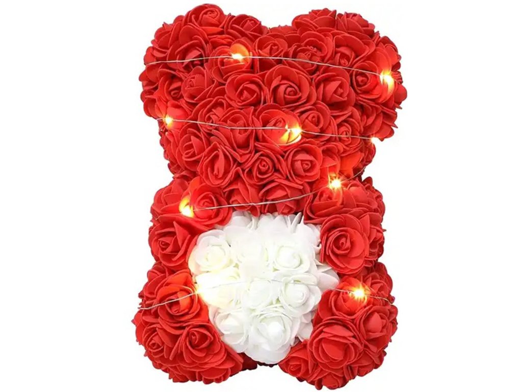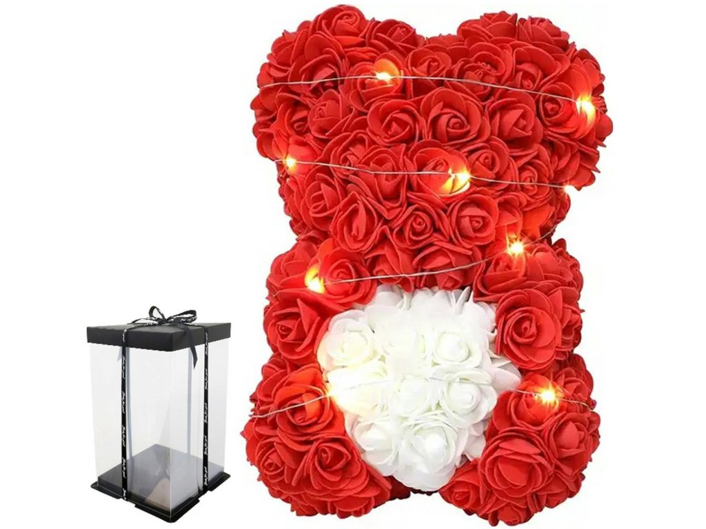 Medvídek z červených růží držící bílé srdce. Perfektní nápad na dárek k Valentýnu nebo netradiční dárek. Medvídek má dodatečné neutrální bílé LED podsvícení. :)