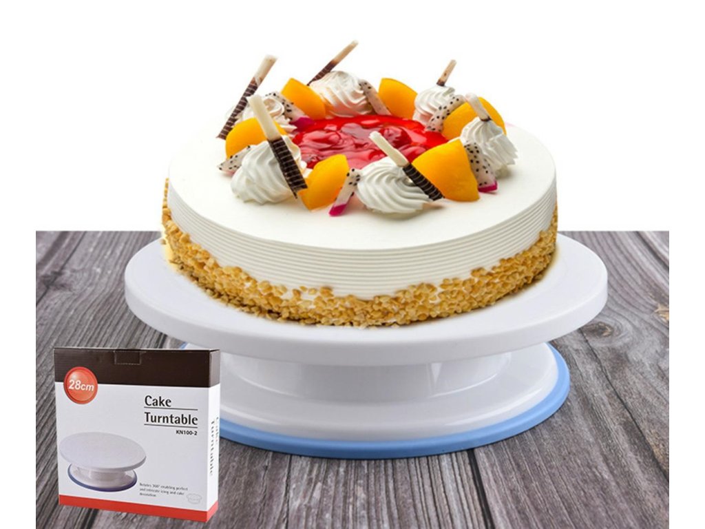 Otočný stojan na zdobení dortů a koláčů. Stojan se volně a bezpečně otáčí v obou směrech, což značně usnadňuje veškeré zdobení a cukrářské práce. Funguje také perfektně jako stojan na vystavení nebo servírování veškerého pečiva. Stojan má silikonovou protiskluzovou základnu, která zabraňuje jeho klouzání.