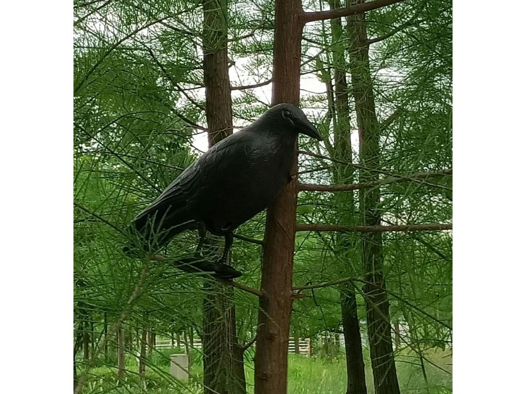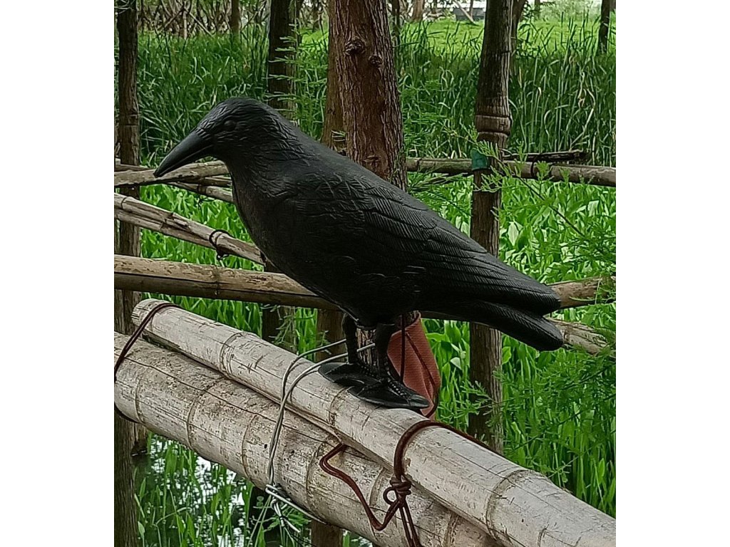- Umělý havran s realistickým vzhledem a velikostí, který odpuzuje ptáky (holuby, špačky atd.) krmící se na pozemku nebo na zahradě.