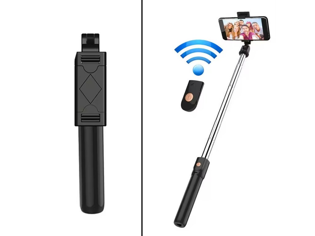 Stačí umístit telefon do nastavitelného držáku a připojit jej přes Bluetooth k vysílači tyče. Po zapnutí fotoaparátu můžete fotit pomocí spouště (tlačítka) na vyhrazeném dálkovém ovladači/vysílači!