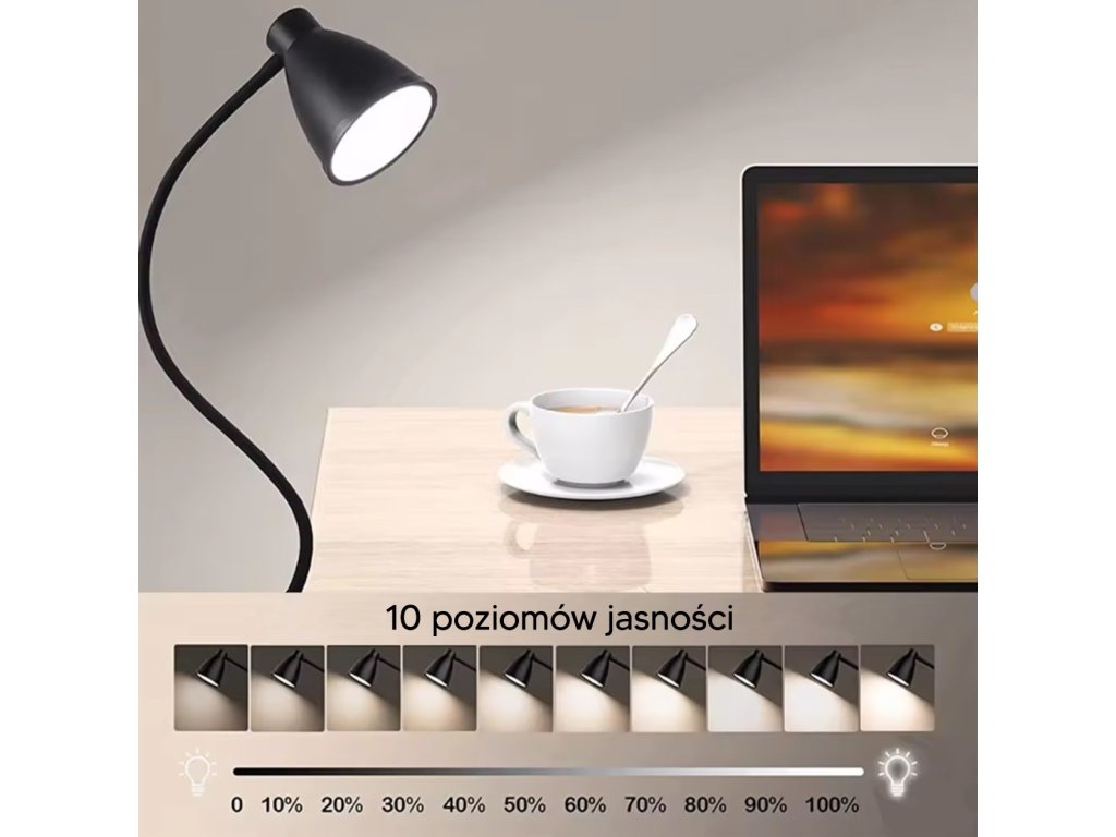 Stolní LED lampa vybavená pohodlnou sponou pro montáž na stůl. Perfektní vychytávka pro osvětlení stránek čtených knih a pro práci u počítače. Napájení dlouhým USB kabelem, který zajišťuje skvělé pohodlí při používání. Flexibilní čelenka umožňuje nastavit světlo lampy v libovolném úhlu. USB kabel je vybaven dálkovým ovládáním, které umožňuje snadnou změnu barvy světla (ve 3 úrovních) a úrovně jasu na stupnici od 1 do 10. Díky tlumenému designu se svítidlo perfektně hodí do každé místnosti.