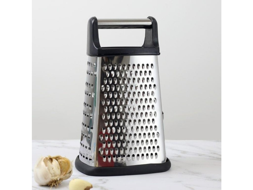 Robustní ocelové kuchyňské struhadlo. Vybaveno čtyřmi různými typy čepelí na každé straně. Pohodlná rukojeť nahoře pomáhá udržet struhadlo na místě během práce. Protiskluzová spodní strana zabraňuje klouzání struhadla po pracovní desce.