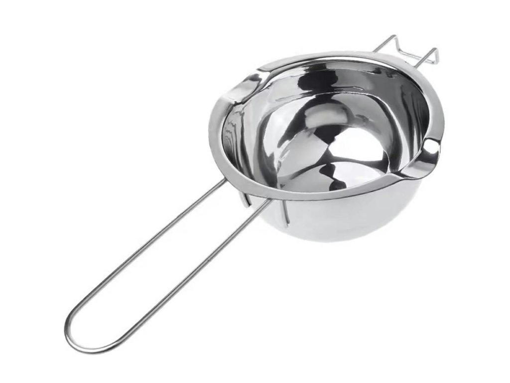 Prostorná nádoba na vosk a parafín. Hluboká mísa je vyrobena z robustní nerezové oceli a má po stranách dva otvory pro snadné nalévání roztaveného materiálu. Dlouhá rukojeť a tvarovaný háček v přední části mísy umožňují připevnění nádoby k hrnci bez rizika uklouznutí.