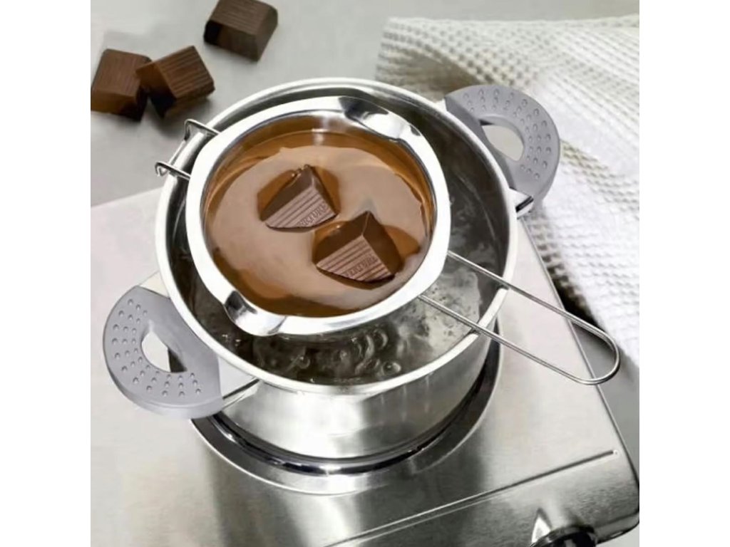 - Dlouhá rukojeť a profilovaný háček v přední části mísy umožňují připevnit tavicí zařízení k hrnci bez rizika jeho sklouznutí.