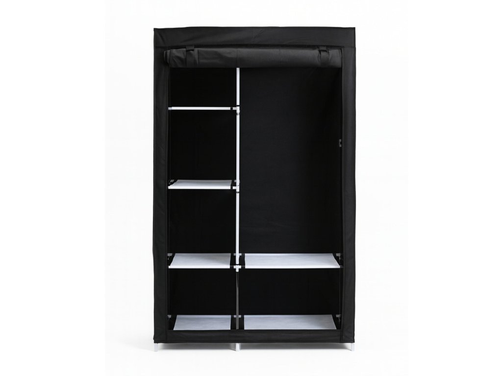 Tekstylna szafa na ubrania w kolorze czarnym to lekkie, funkcjonalne i estetyczne rozwiązanie do przechowywania garderoby w domu, biurze lub pokoju młodzieżowym. Konstrukcja oparta na metalowych rurkach oraz trwałym pokrowcu gwarantuje stabilność i ochronę ubrań przed kurzem — również od spodu, dzięki pełnemu materiałowemu wykończeniu. Przemyślany układ półek, bocznych kieszeni oraz wieszaka pozwala wygodnie uporządkować odzież i akcesoria.