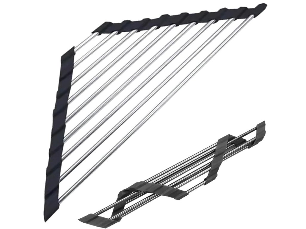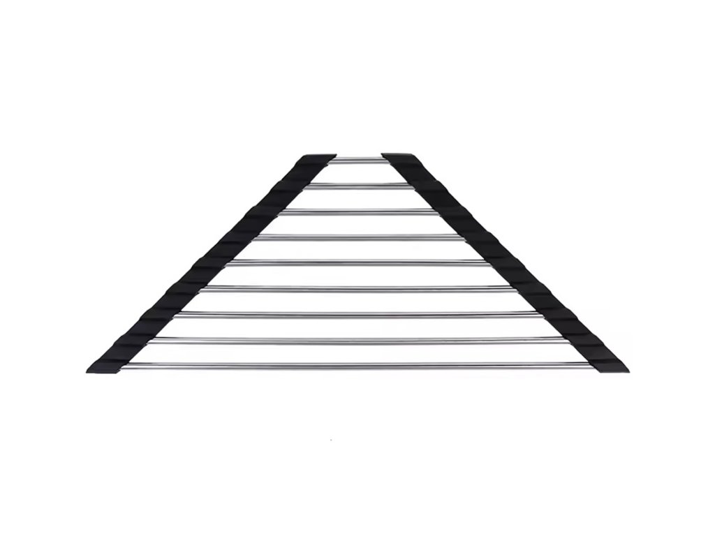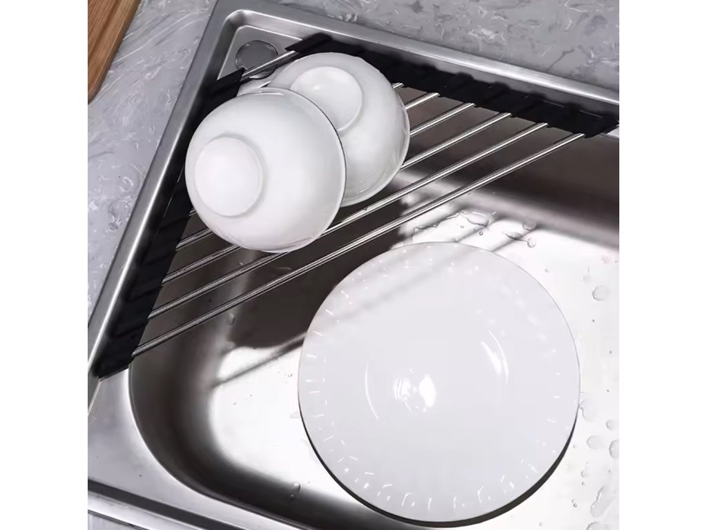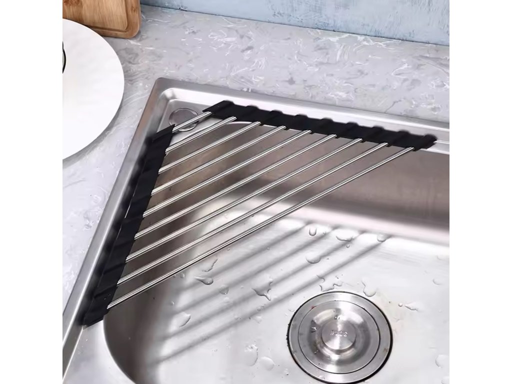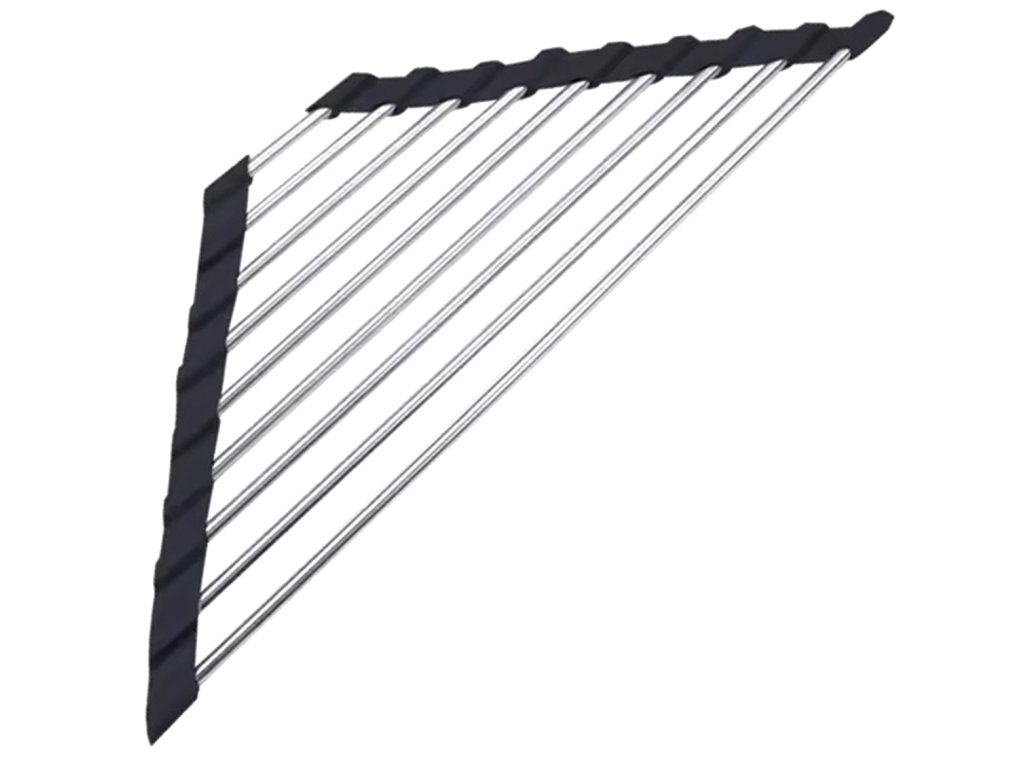 Univerzální výsuvný odkapávač dřezu v trojúhelníkovém tvaru. Rohové provedení se skvěle hodí do menších kuchyní. Vybaveno až 9 hustě umístěnými ocelovými tyčemi. Silikonové okraje usnadňují umístění sušičky na dřez. Možnost srolování výrazně usnadňuje uložení odkapávače do skříně nebo šuplíku. Tlumený vzhled se hodí do každé kuchyně.