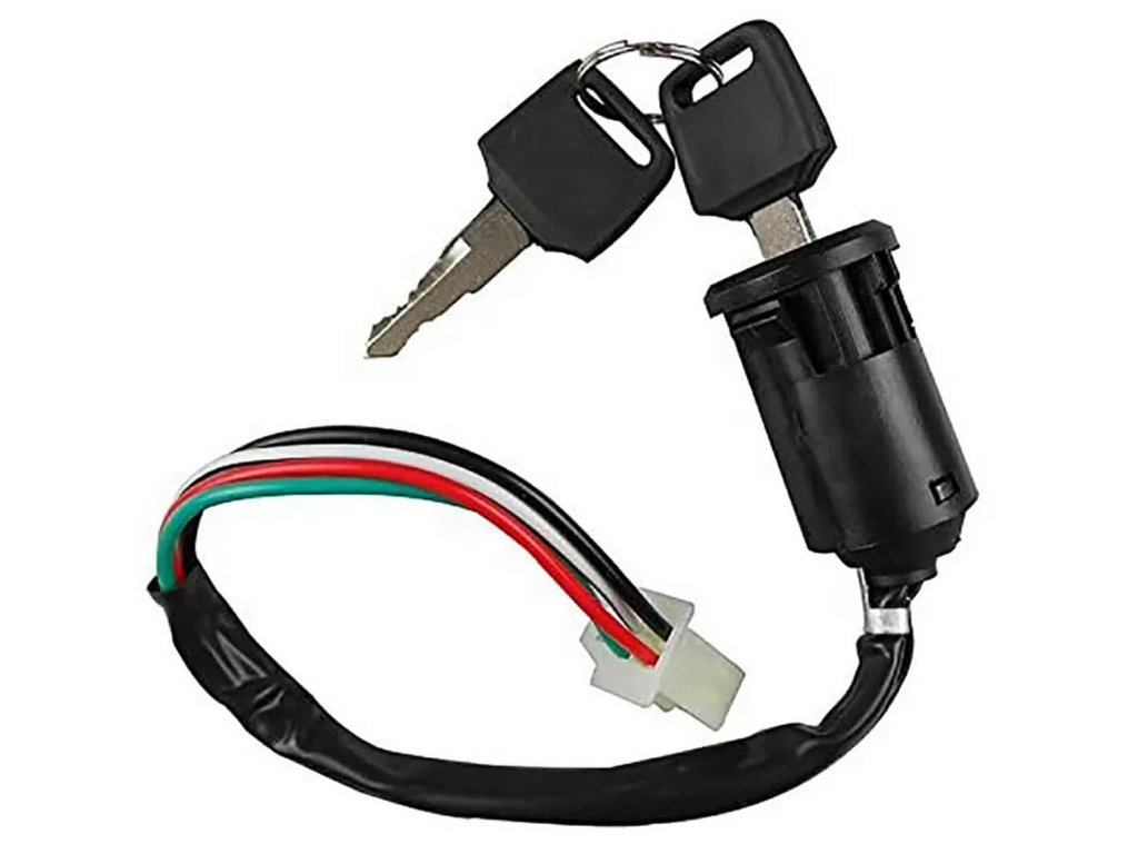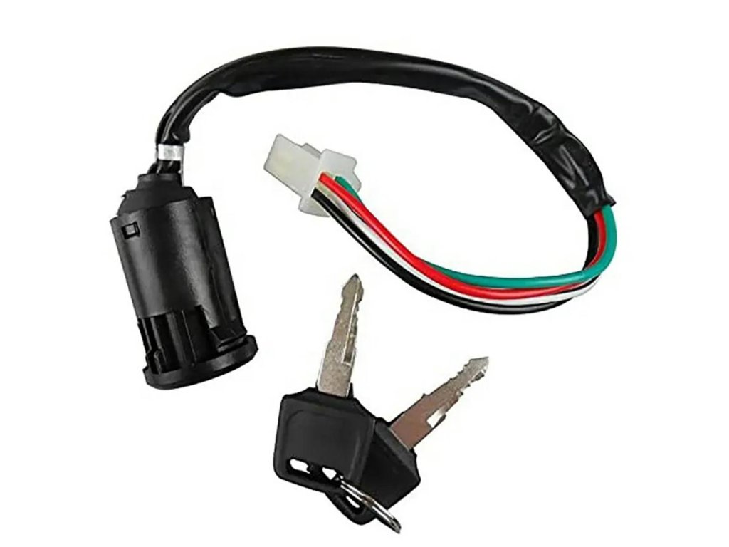 Univerzální spínač zapalování určený pro čtyřkolky (ATV) a motocykly. Zásuvka vybavená 4kolíkovým konektorem. Sada obsahuje také 2 klíče pro zapalování.