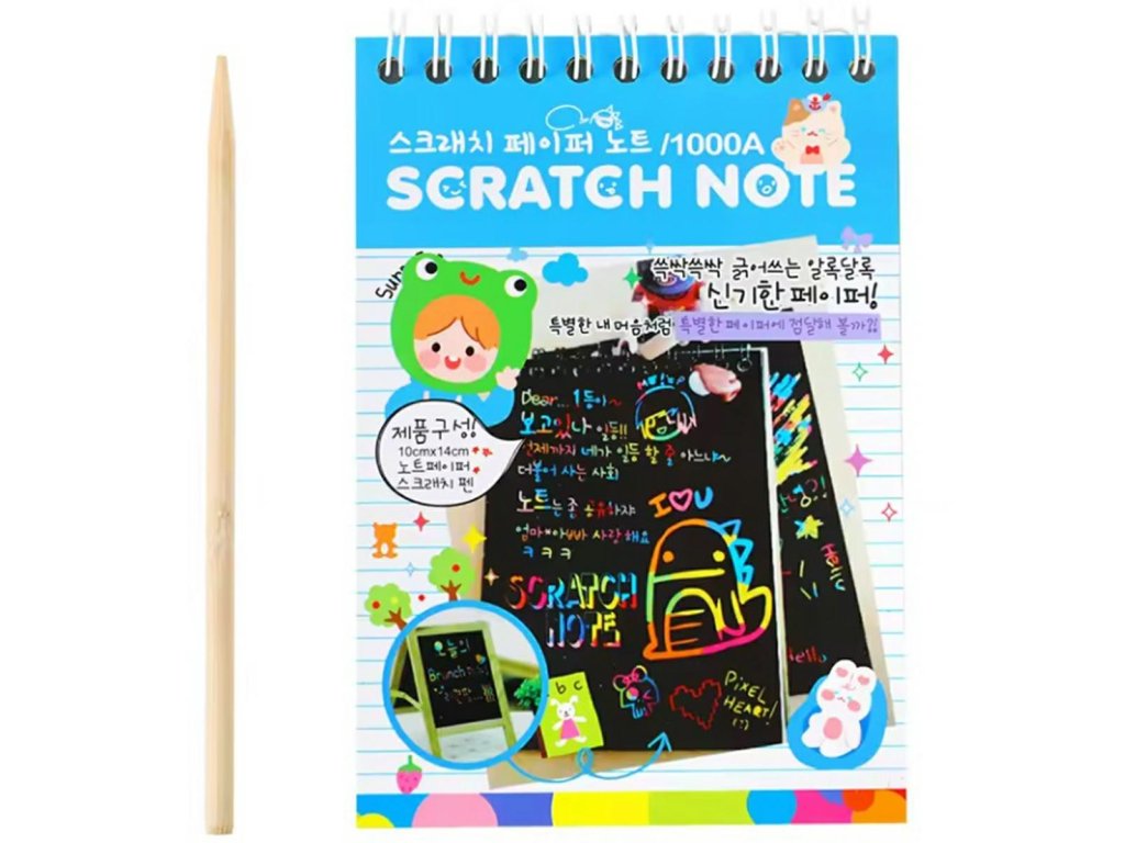 Duhová podložka formátu A6 na škrábání. Stírací los je mimořádně kreativní hračka pro děti. Nevyžaduje další pera, kromě dřevěného stylusu, který je součástí sady. Blok má až 10 listů černého papíru, pod kterým je skrytá barevná vrstva. Stačí použít stylus a poškrábat část papíru a odhalit barevný obrázek.