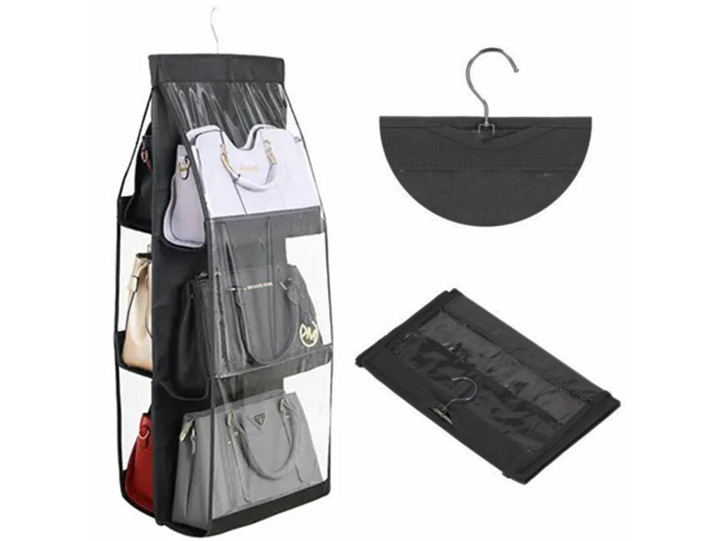Pevný závěsný organizér na tašku. Umožňuje zavěsit až 6 sáčků najednou. Určeno pro montáž do šatní skříně (stačí ji rozložit a zavěsit do skříně pomocí přiloženého věšáku). Skvělý způsob, jak ušetřit místo! Vyrobeno z odolného plastu, který zaručuje dlouhé a bezproblémové používání. Kompletně skládací - zabírá málo místa, když se nepoužívá.