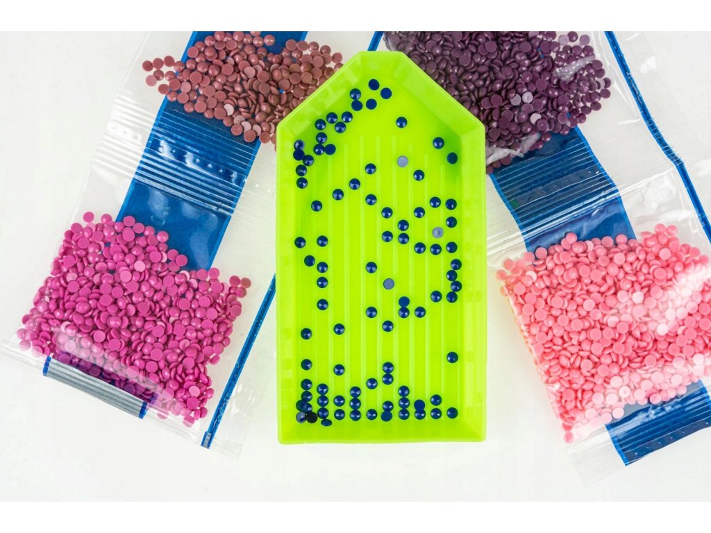 - Vyberte si diamanty, které budete lepit. Najděte příslušné symboly a čísla na odkryté části plátna. Nasypte část krystalů vybrané barvy do plastové nádoby.