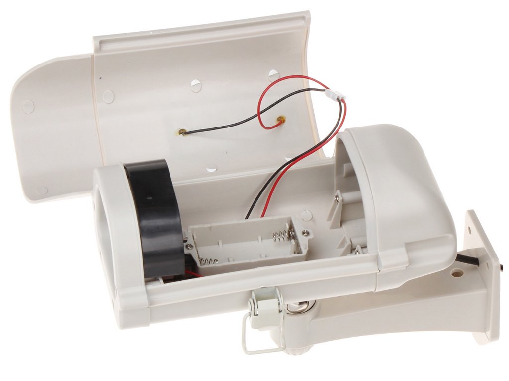 Integrovaná LED dioda, která bliká a svítí červeně, signalizuje činnost zařízení, takže atrapa kamery vypadá velmi realisticky. LED dioda je napájena integrovaným solárním panelem, který lze kdykoli odpojit, nebo bateriemi/akumulátory AA umístěnými pod krytem.