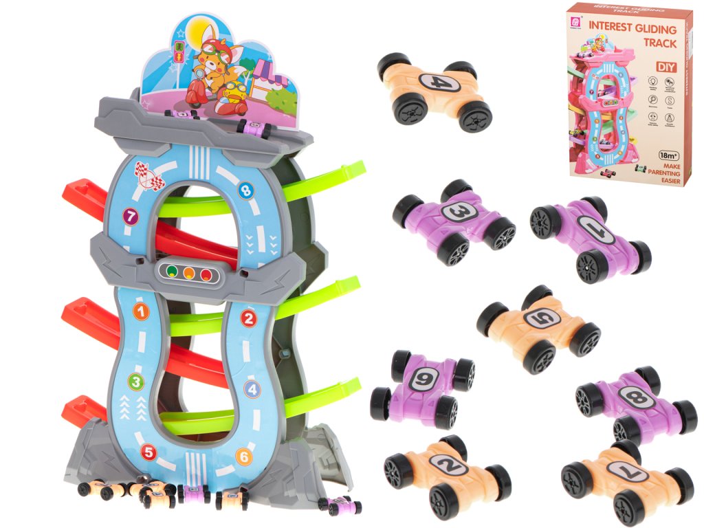 Autodráha obsahuje osm barevných autíček, která se mohou přetáčet a tím tak snadno zdolávají kaskádu barevných silniček. Postavte autíčko na nejvyšší část autodráhy a sledujte, jak rychle se dostane dolů!