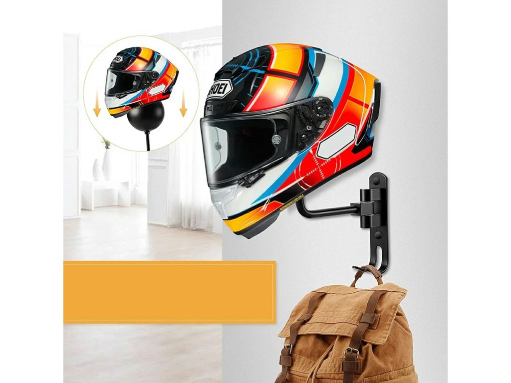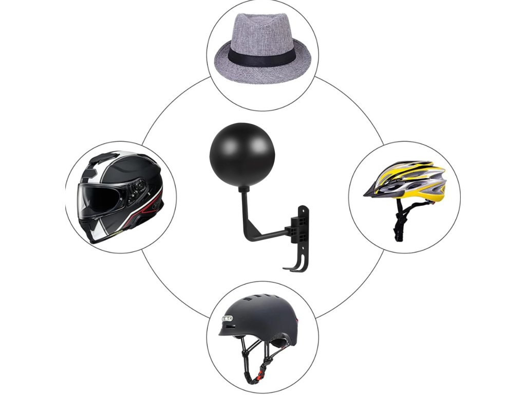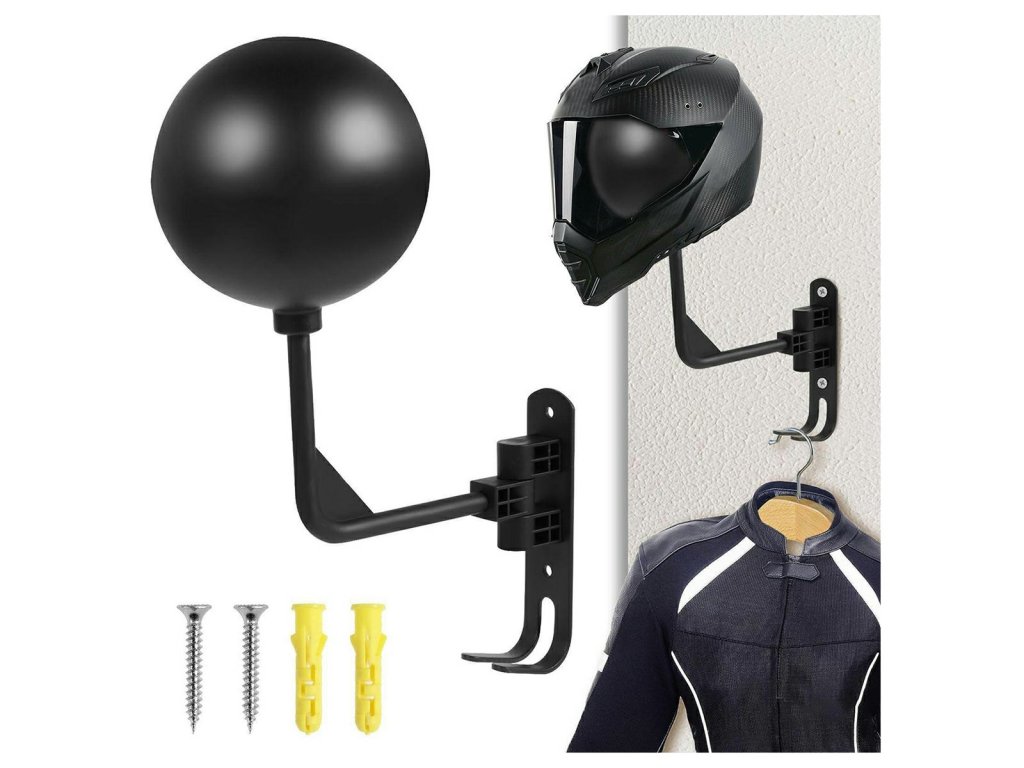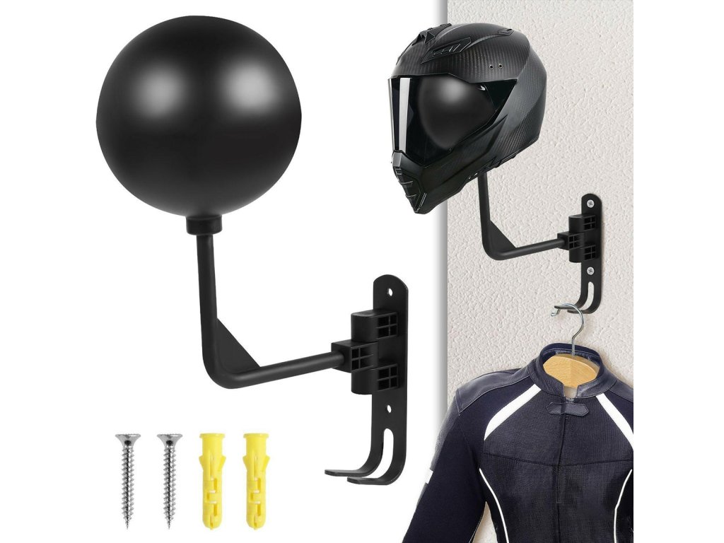 Nástěnný věšák na motocyklovou helmu. Jeho chytrý design (kulovitý tvar) zabraňuje deformaci polstrování helmy. Lze jej horizontálně nastavit o 180 stupňů. Dva další háčky ve spodní části držáku umožňují zavěšení dalšího příslušenství. Věšák je vyroben z odolných materiálů, což zaručuje dlouhé a bezproblémové používání. Funguje také dobře jako standardní věšák na čepici nebo cyklistickou helmu. Veškeré potřebné montážní příslušenství (šrouby a hmoždinky) je součástí balení.