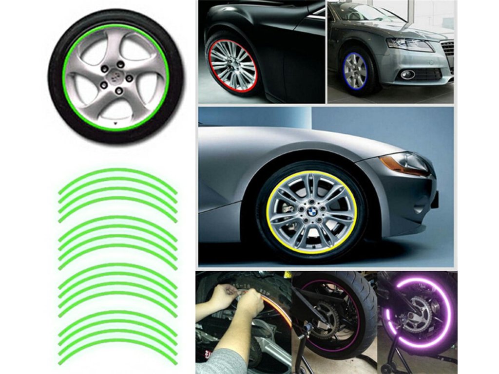Reflexní samolepky na kola a pneumatiky automobilů nebo motocyklů. Zlepšují viditelnost a bezpečnost na silnici a zároveň vytvářejí úžasný efekt, zejména v noci.