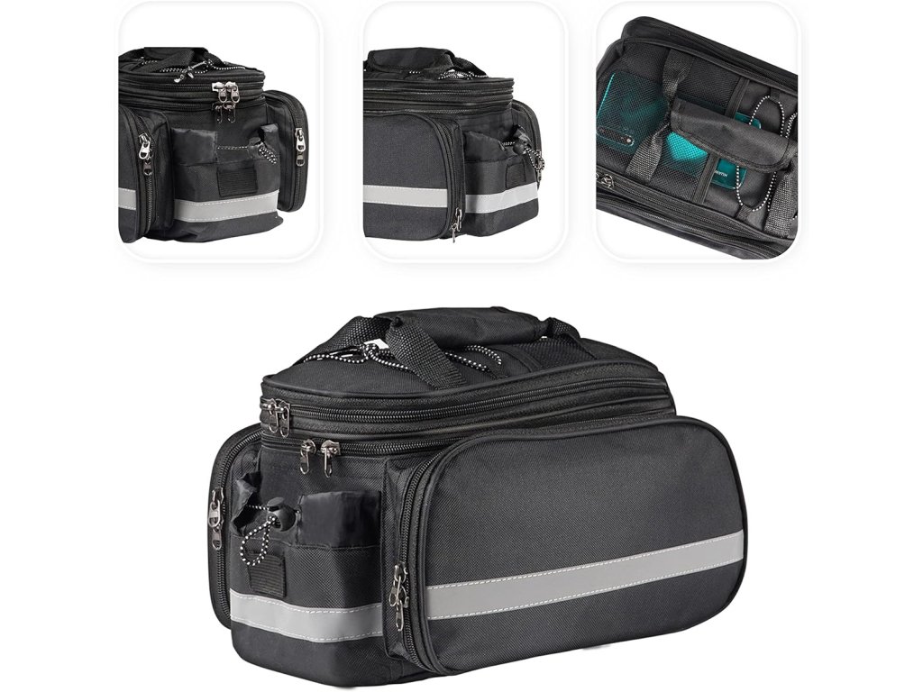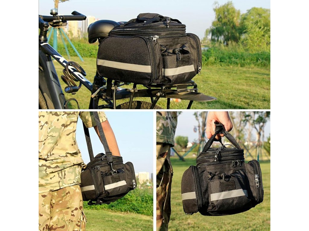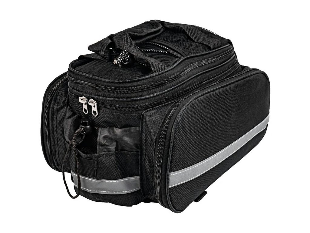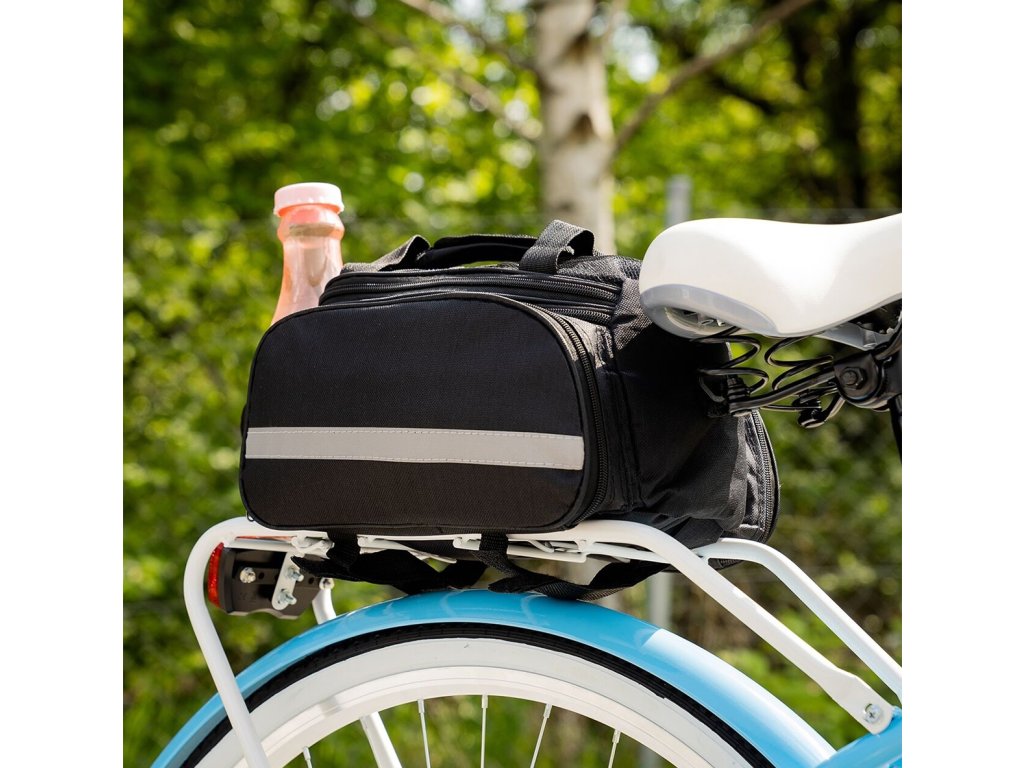Prostorná brašna na kolo, vyrobená z odolné a snadno čistitelné polyesterové tkaniny. Mimořádně užitečné při delších i kratších výletech na kole. Taška je vybavena prostornou hlavní přihrádkou uzavíratelnou na zip a 3 dalšími, zapínanými kapsami (dvě boční kapsy na zip a zadní na suchý zip). Dodatečný držák na láhev s vodou usnadňuje přenášení nápojů s sebou. Taška má také reflexní prvky, které zvyšují naši bezpečnost a činí nás viditelnými ve tmě. Taška se připevňuje k nosiči jízdních kol (vzadu) pomocí pásků na suchý zip. Díky nasazenému popruhu a rukojeti ji můžete použít i jako kabelku - o jejím účelu tedy rozhodujete vy.
