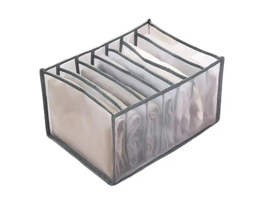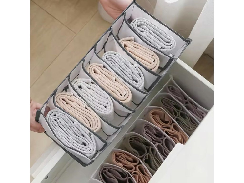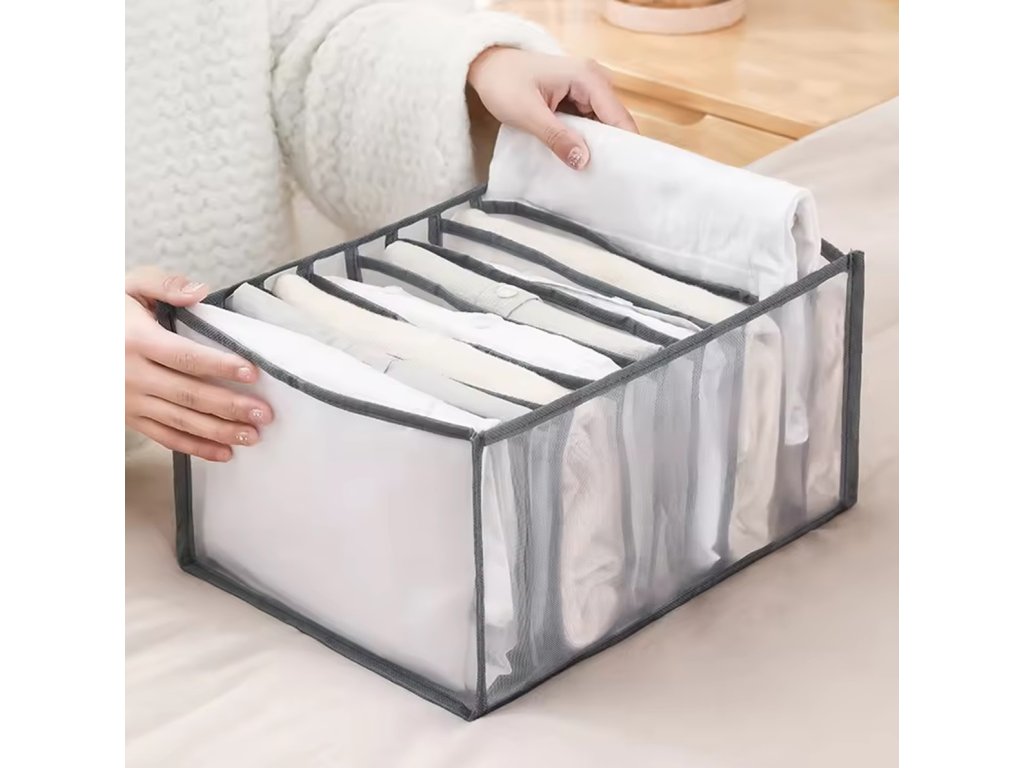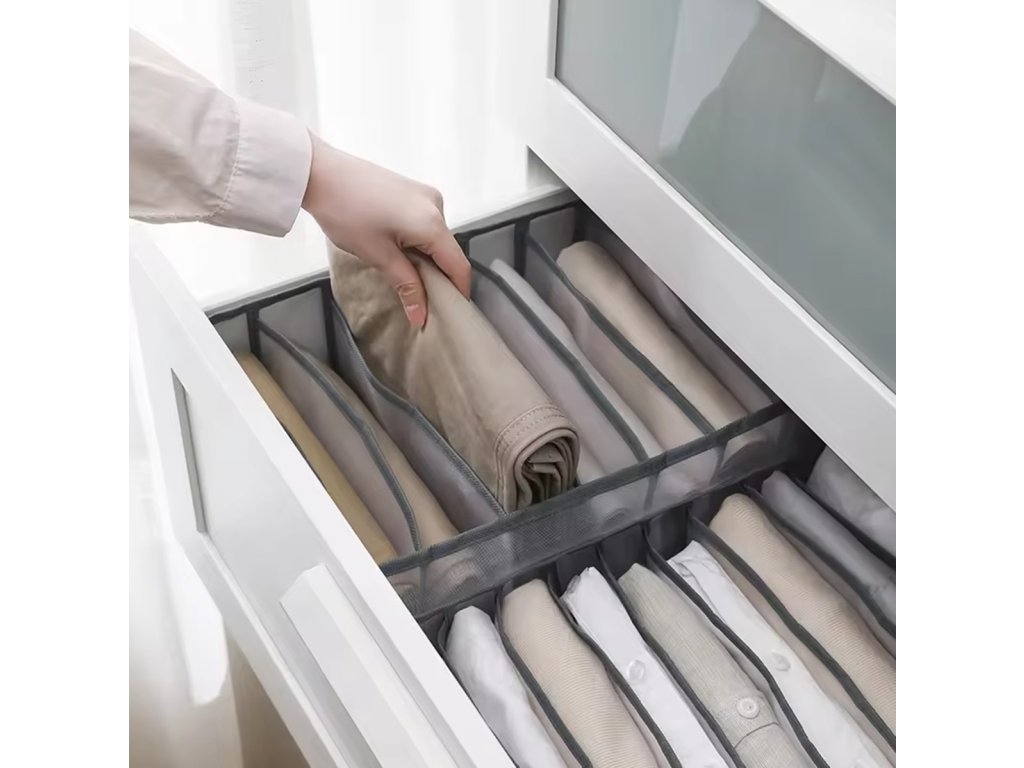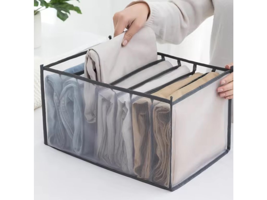 Organizér na oblečení se 7 otevřenými přihrádkami. Věnováno skladování kalhot / džínů. Konečně po otevření šuplíku ihned najdete potřebné oblečení. Vyrobeno z kvalitního, prodyšného materiálu, který se snadno čistí - strany organizéru jsou průhledné. Organizér nemá horní uzávěr, aby byl přístup k předmětům v něm uloženým ještě jednodušší. Schopnost rychle složit a rozložit vám umožní ušetřit další místo!