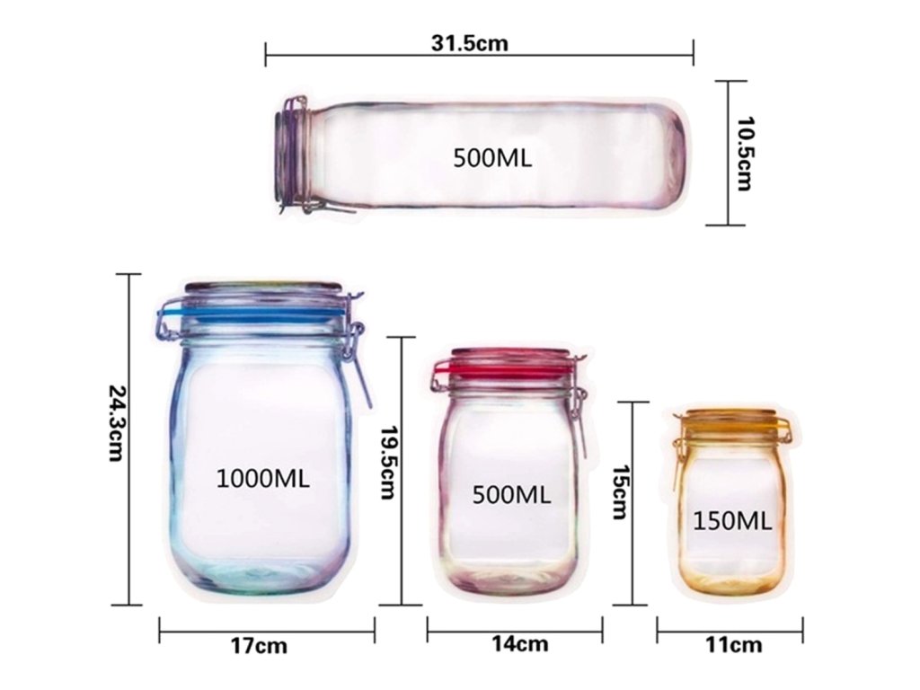 Sada 20 sáčků na zip pro bezpečné skladování potravin. Originální tvar s potiskem sklenice. Sada obsahuje 4 různé velikosti umožňující balení menších i větších porcí.