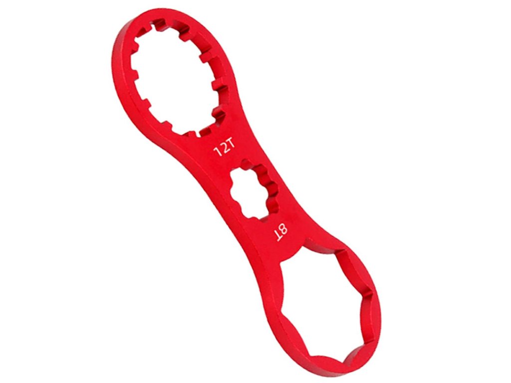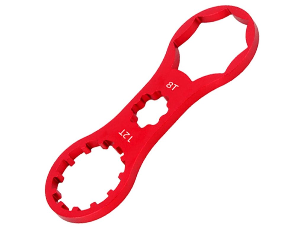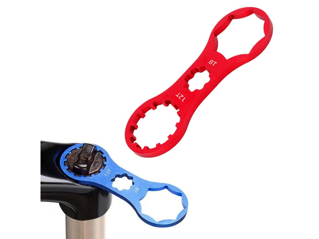 Klíč na zástrčky tlumičů, nezbytný pro servis každého jízdního kola. Speciální nástroj pro demontáž předních tlumičů. Nenahraditelný, když je potřeba jej vyměnit nebo opravit. Velmi pohodlné použití a odolné. Vybaveno 2 typy nástrčkových klíčů, velikost 8T a 12T.