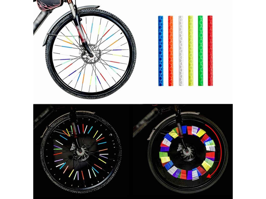 Reflexní trubice namontované na paprsky jízdního kola. Sada obsahuje 12 reflektorů. Snadná instalace pomocí 3M pásky. Reflektory jsou skvěle viditelné po setmění a výrazně zvyšují naši bezpečnost na silnici.