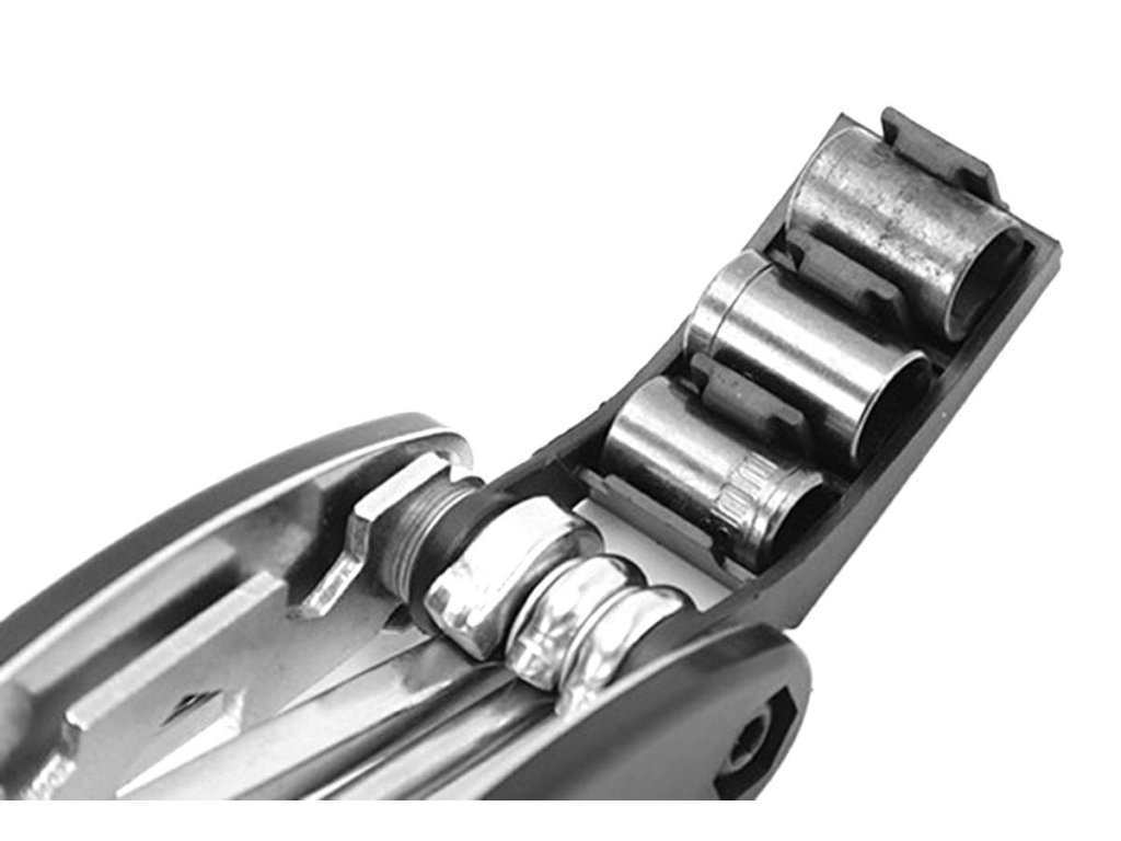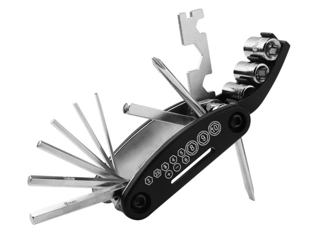 Sada klíčů na kolo! Velmi praktická a prostorově nenáročná vychytávka pro každého vášnivého cyklistu. Od nynějška můžete provádět jakoukoli drobnou opravu jízdního kola na silnici, aniž byste museli nosit asi tucet nářadí zvlášť! Sada obsahuje 16 nářadí pro údržbu jízdních kol a drobné opravy. Celá věc byla uzavřena v praktickém a kompaktním kapesním noži. Po složení padne snadno do ruky, snadno se skladuje a v tašce na kolo nebo kufru nezabere mnoho místa. Sada obsahuje imbusové klíče, šroubováky, zásuvky s adaptérem, vidlicové klíče a speciální 14GE klíč na paprsky.