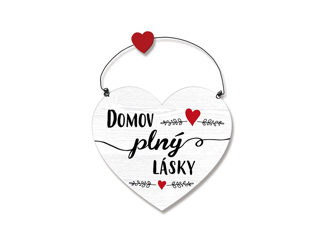 Moderní, stylová a dekorativní dřevěná cedulka ve tvaru srdce s motivačními textem „Domov plný lásky“. Cedulka se dá jednoduše pomocí drátku zavěsit na stěnu nebo jen tak o něco opřít.