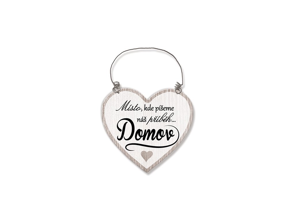 Dekorativní dřevěná cedulka ve tvaru srdce v menším rozměru s textem „Místo, kde píšeme náš příběh… Domov“.