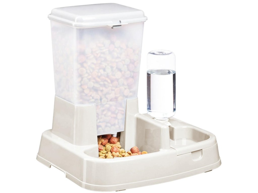 Automatický dávkovač vody a suchého krmiva pro domácí zvířata. Rozhodně to usnadňuje porcování potravy našeho mazlíčka. Láhev na vodu o objemu 0,5 l umožňuje vašemu mazlíčkovi neustálý přístup k čerstvé vodě. Velká nádoba na potraviny s uzavřeným víkem zajišťuje dlouhou zásobu vždy čerstvých potravin. Zařízení umožňuje upravit velikost porce (v závislosti na míře posunutí klapky ve spodní části). Jedná se o vynikající nástroj, který majiteli zvířete umožní odejít na několik dní pryč, aniž by se staral o hlad a žízeň zvířete.
