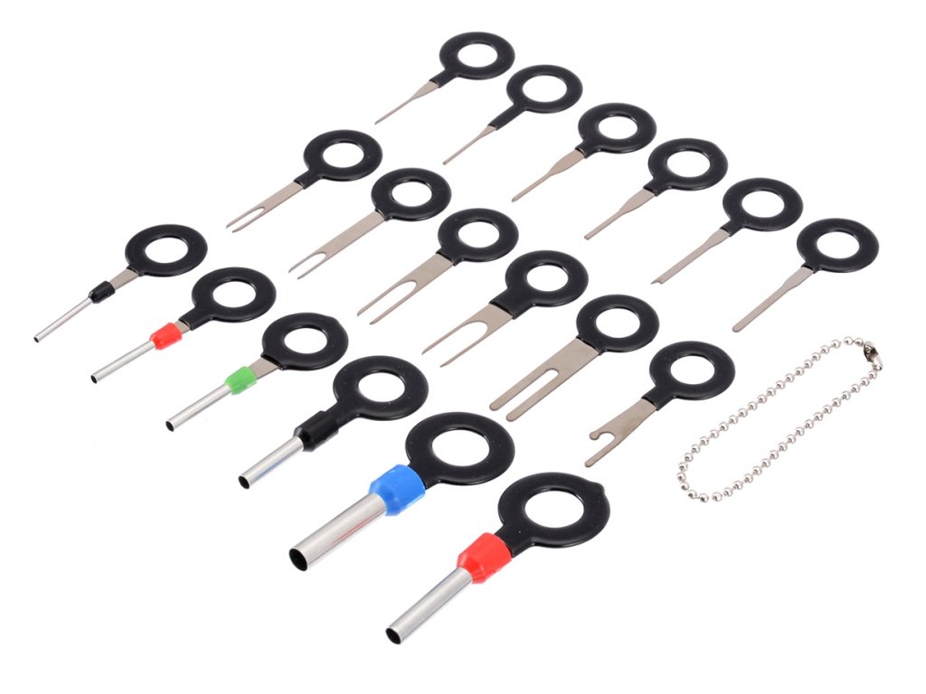 Univerzální sada 18 kusů vytahovačů pro vytahování kolíků (spojek). Sada se skládá ze 3 typů klíčů (jednoduchý, dvojitý a trubkový) různých tlouštěk. Jsou perfektní pro opravy elektrických a instalačních kostek. Povinná výbava pro všechny osoby zapojené do oprav automobilových elektrických systémů nebo počítačového vybavení.