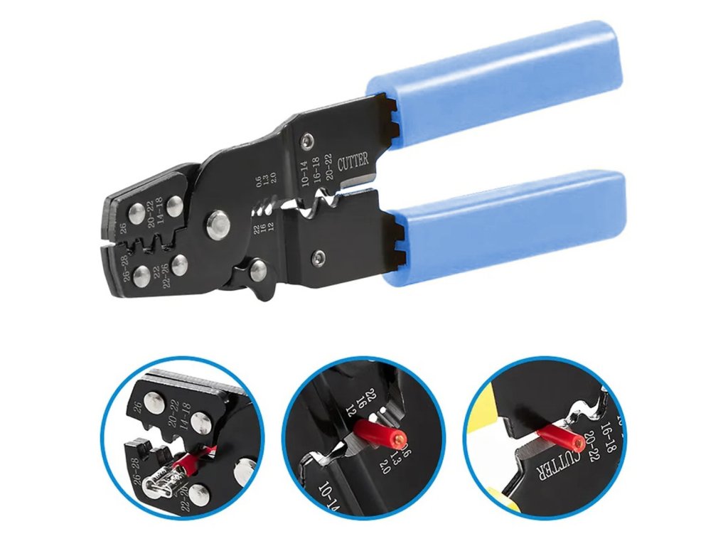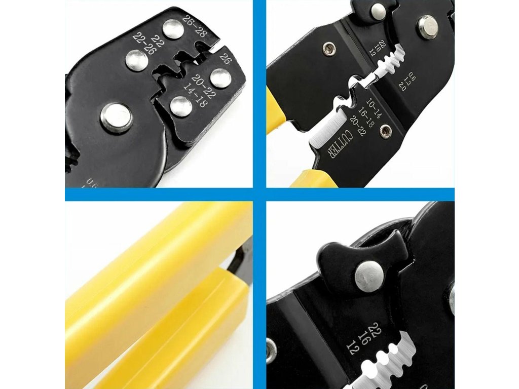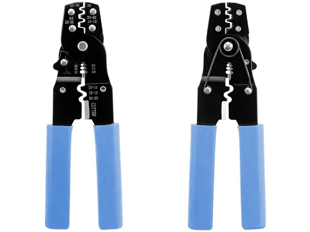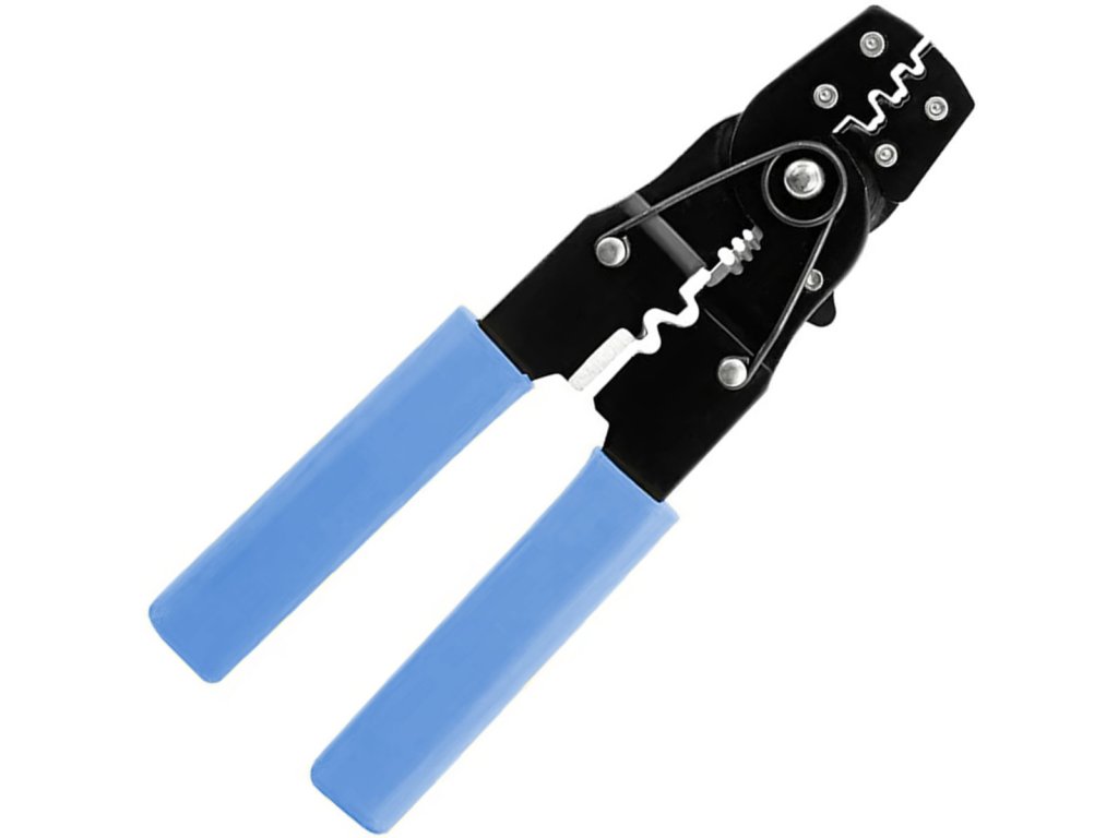 Univerzální krimpovač pro zástrčky, neizolované a izolované konektory. Vybaveno přídavným nožem na řezání drátu. Nezbytná výbava každého instalatéra elektroinstalace a elektroniky, ale hodí se i pro typické domácí aplikace.