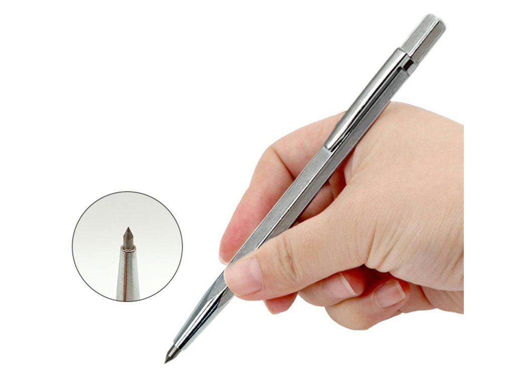 Nástroj na rýhování dlaždic s karbidovým hrotem, 140 mm dlouhý. Šestihranný profil zajišťuje pohodlné používání, zatímco přívěsek ve tvaru pera umožňuje pohodlné připevnění stylusu na opasek nebo do kapsy.