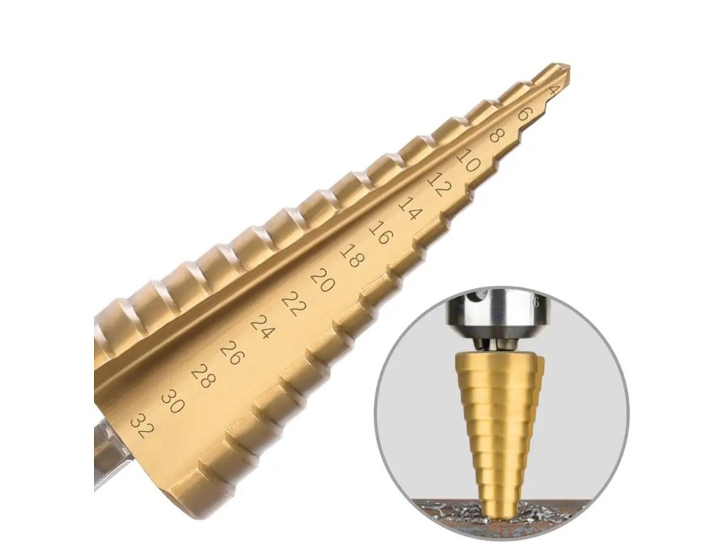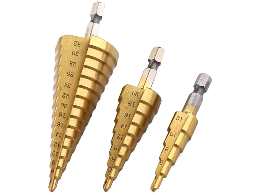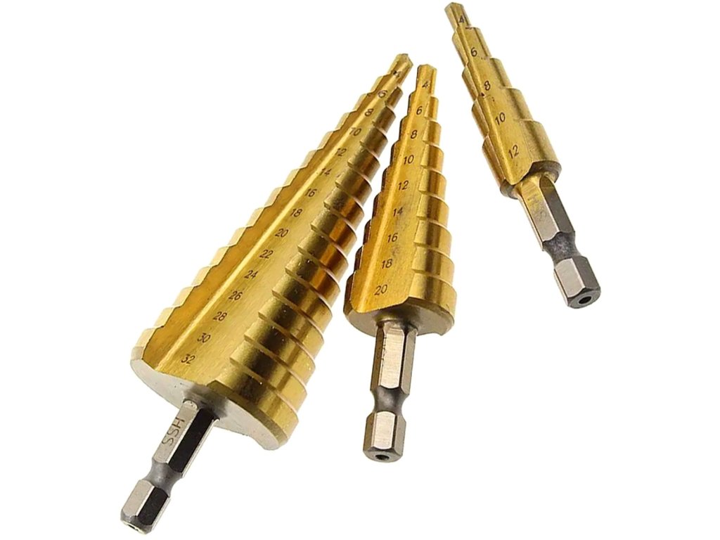 Sada 3 broušených vrtáků z rychlořezné oceli (HSS) se zpevňujícím titanovým povlakem. Jsou perfektní pro zpracování tenkých plechů, plastů a všech kovů bez železa ve slitině. Odstupňované každé 2 mm (průměr od 4 do 32 mm). Mají standardní HEX rukojeť a laserem řezané číslování.