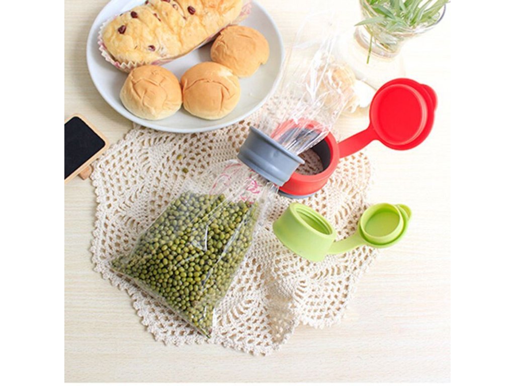 Ochraňte vaše potraviny v igelitových pytlících a sáčcích pomocí těchto šikovných víček na pytlíky. Víčka se lehce nasadí na okraj igelitového pytlíku a zajistí. Tím vznikne otevíratelné víčko, díky kterému můžete snadno vysypat obsah pytlíku a pak pytlík opět uzavřít. Skladujte pohodlně cereálie, bonbony, sušenky, chipsy ale třeba i granule. Veškeré potraviny budou bezpečně uzavřené, chráněné proti vlhku a škůdcům a také zabráníte jejich rozsypání. V balení najdete tři víčka v různých rozměrech.
