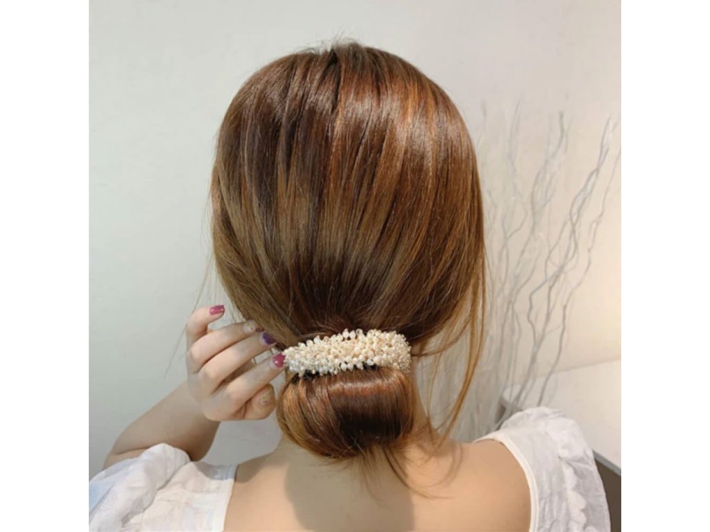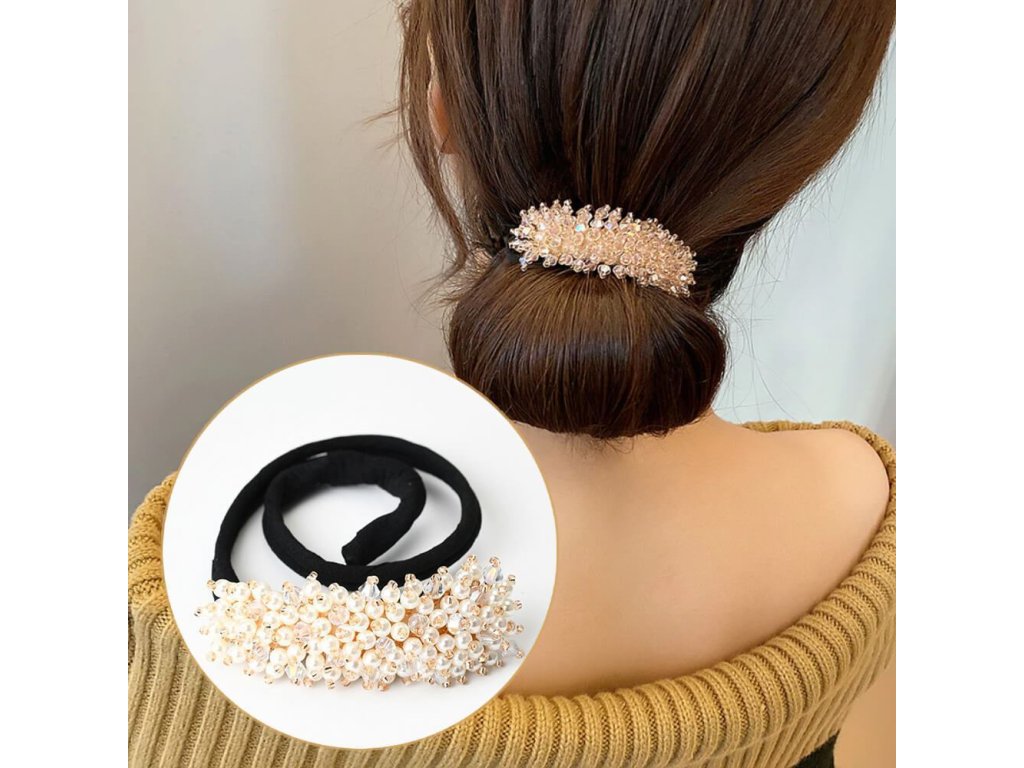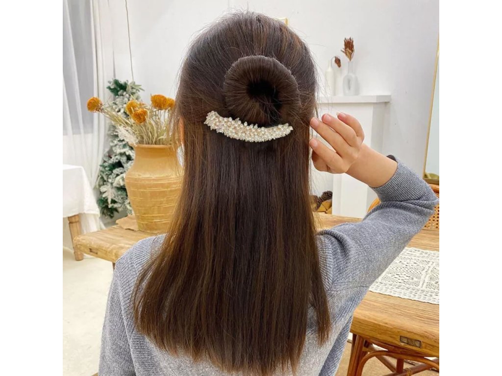 Provlékněte své vlasy očkem ozdoby a stáhněte tak, aby ozdoba byla u konečků vlasů. Poté začněte vlasy na ozdobu namotávat, dokud se nedostanete k temeni hlavy. Část s namotanými vlasy zarolujte do drdolu a část s kamínky poté omotejte kolem drdolu.