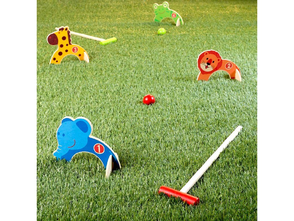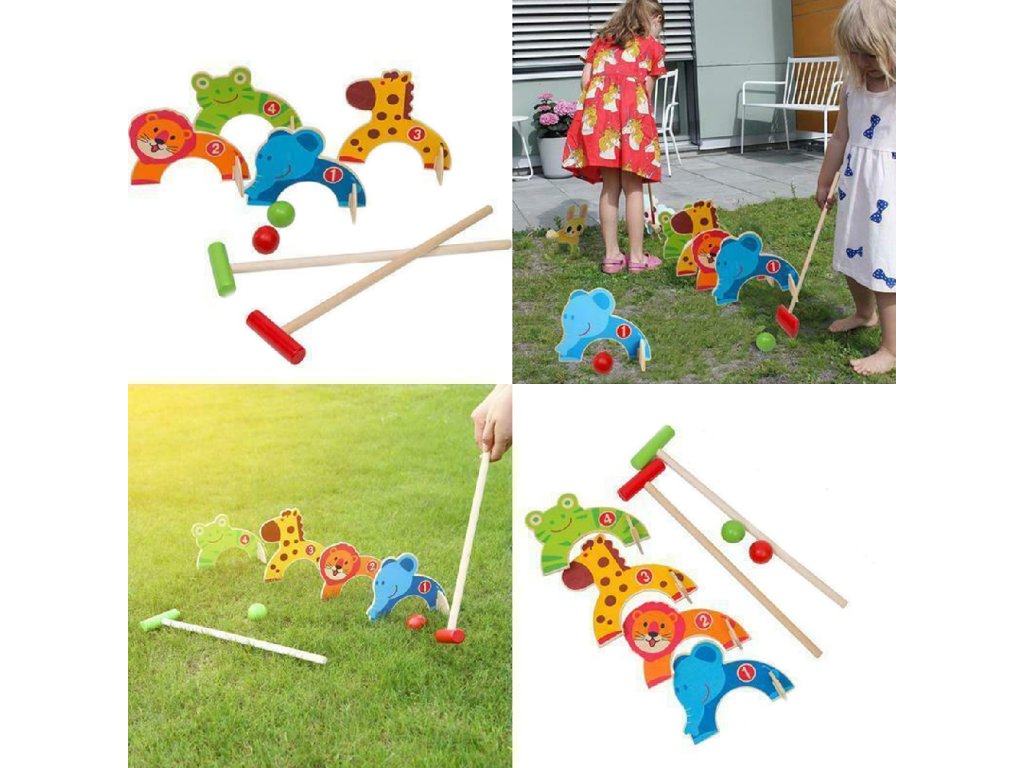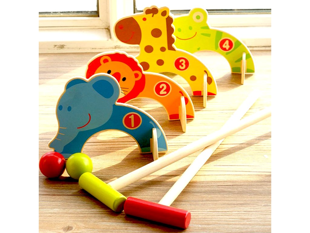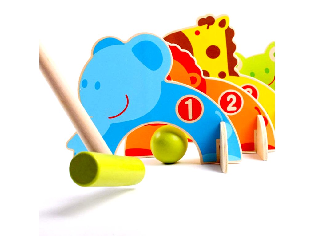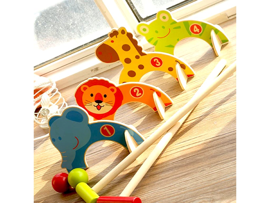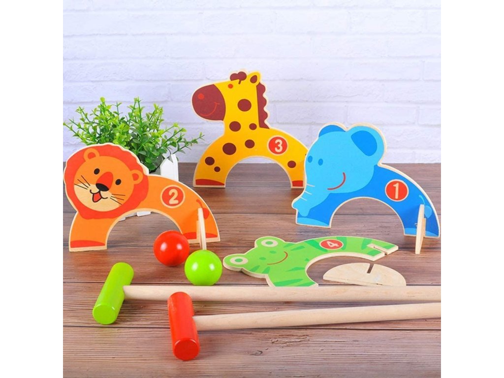 Dětská hra kroket je v hezkém barevném a dřevěném provedení. Účelem hry je dostat míček pomocí pálky skrz barevná zvířátka. Hru lze hrát ve 2 nebo se lze rozdělit na 2 týmy a střídat se v úderech.