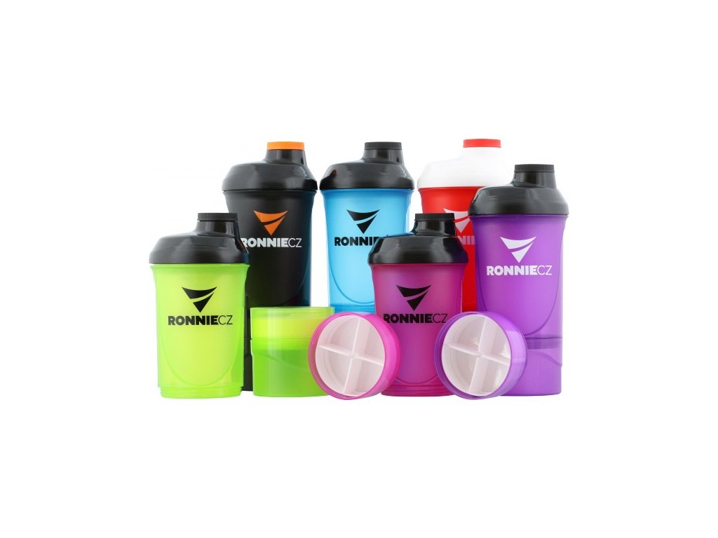 Praktický matný a transparentní šejkr Ronnie.cz se zásobníky na tablety či sypké formy suplementů! Šejkr je dostupný v šesti barevných kombinacích, a to růžovo-černé, zeleno-černé, modro-černé, fialovo-černé, červeno-bílé a černé. Po stranách samotného šejkru jsou v průhledech rysky v ml/oz pro odměření objemu tekutiny (do 500 ml), šejkr samozřejmě obsahuje mřížku pro lepší rozmíchání nápoje. Po stranách šejkru a na malém víčku je umístěno logo Ronnie.cz. První z odnímatelných zásobníků obsahuje vloženou přihrádku se čtyřmi odděleními na tablety či kapsle, přihrádku lze ale i vyjmout, objem takto získaného prostoru (např. pro odsypání proteinu nebo gaineru) je 150 ml. Druhý (spodní) zásobník má objem dalších 200 ml.
