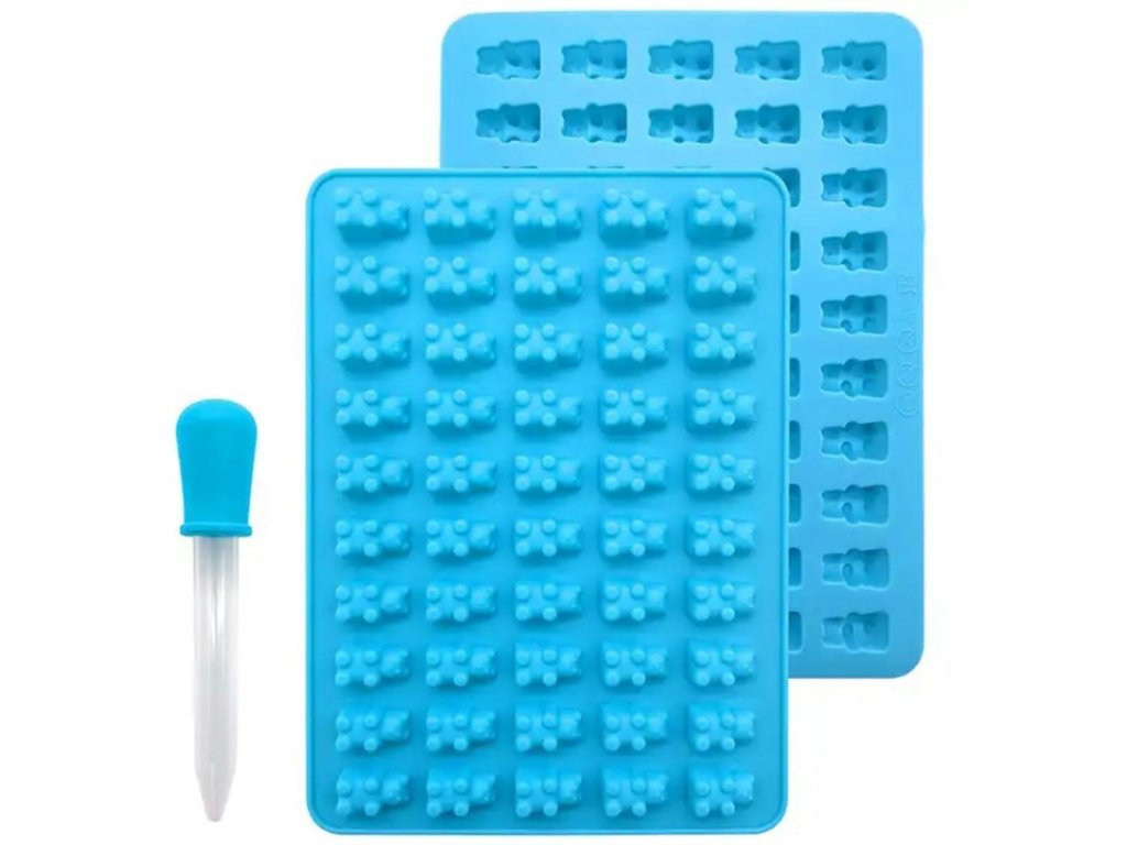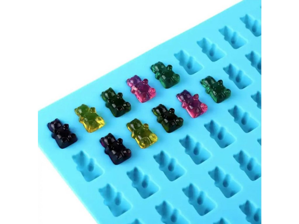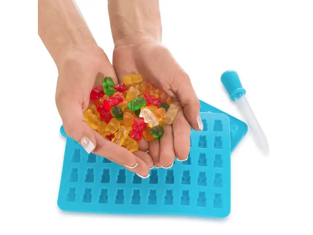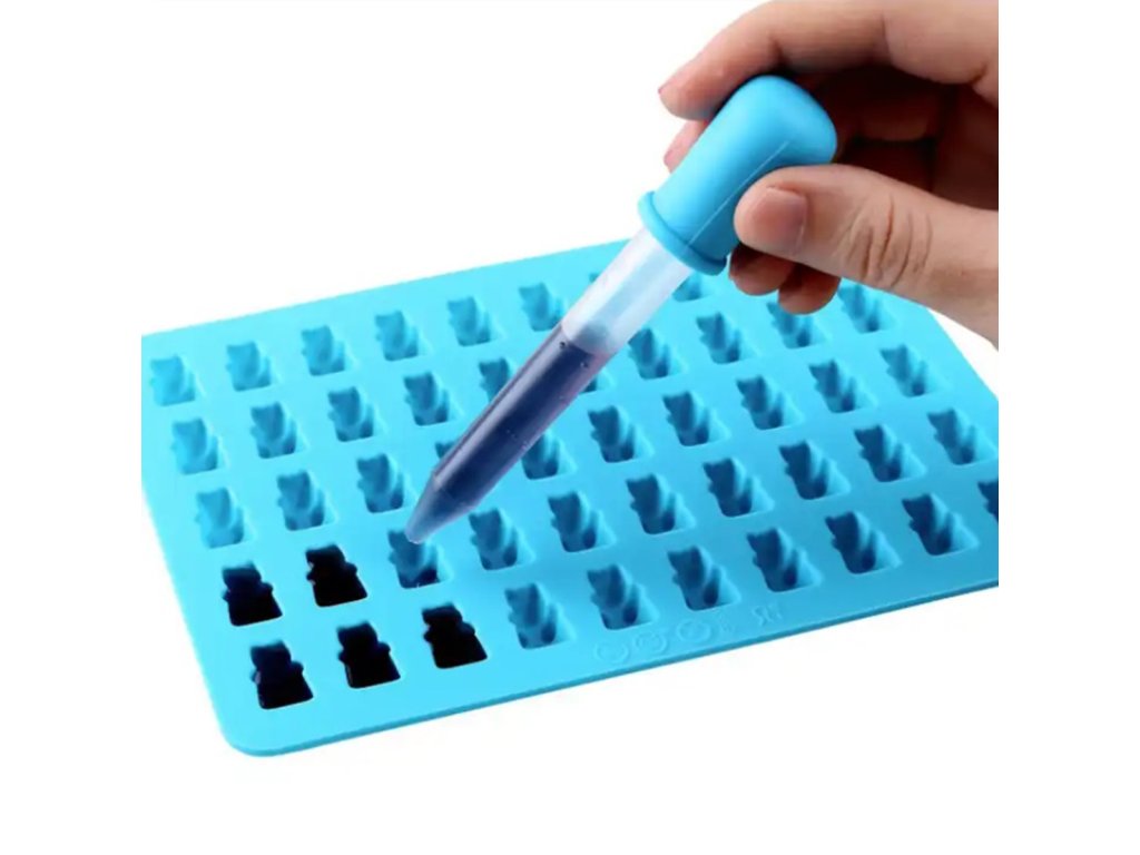 Silikonová forma na výrobu želé, čokolády, ledu. Je vybavena 50 otvory ve tvaru medvídka. Perfektní pro tvarování želé díky své vysoké flexibilitě a přiložené speciální želatinové pipetě. Velmi snadno se udržuje v čistotě a neabsorbuje pachy.