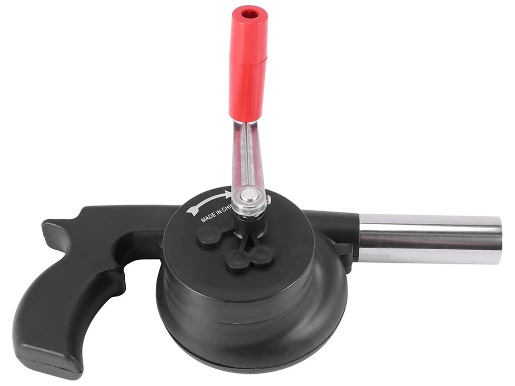 Díky vestavěnému mechanismu s převodovým poměrem 1:36 zajistí každé otočení kliky maximální účinnost při minimální námaze. Vnitřní ventilátor rychle protlačuje vzduch kovovou tryskou, což výrazně urychluje proces spalování. Ergonomická rukojeť ve tvaru pistole zaručuje bezpečné držení a pohodlné ovládání.