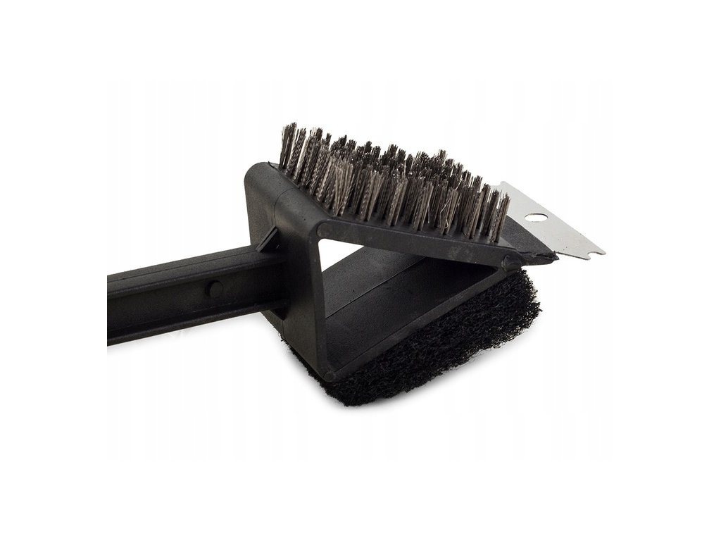 Kartáč umožňuje rychle a efektivně odstranit ztuhlý tuk a saze z roštu vašeho grilu. Je vyroben z odolného plastu a vybaven ocelovými dráty, škrabkou a čistící houbou.