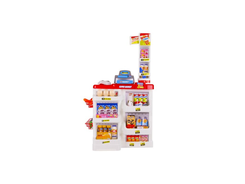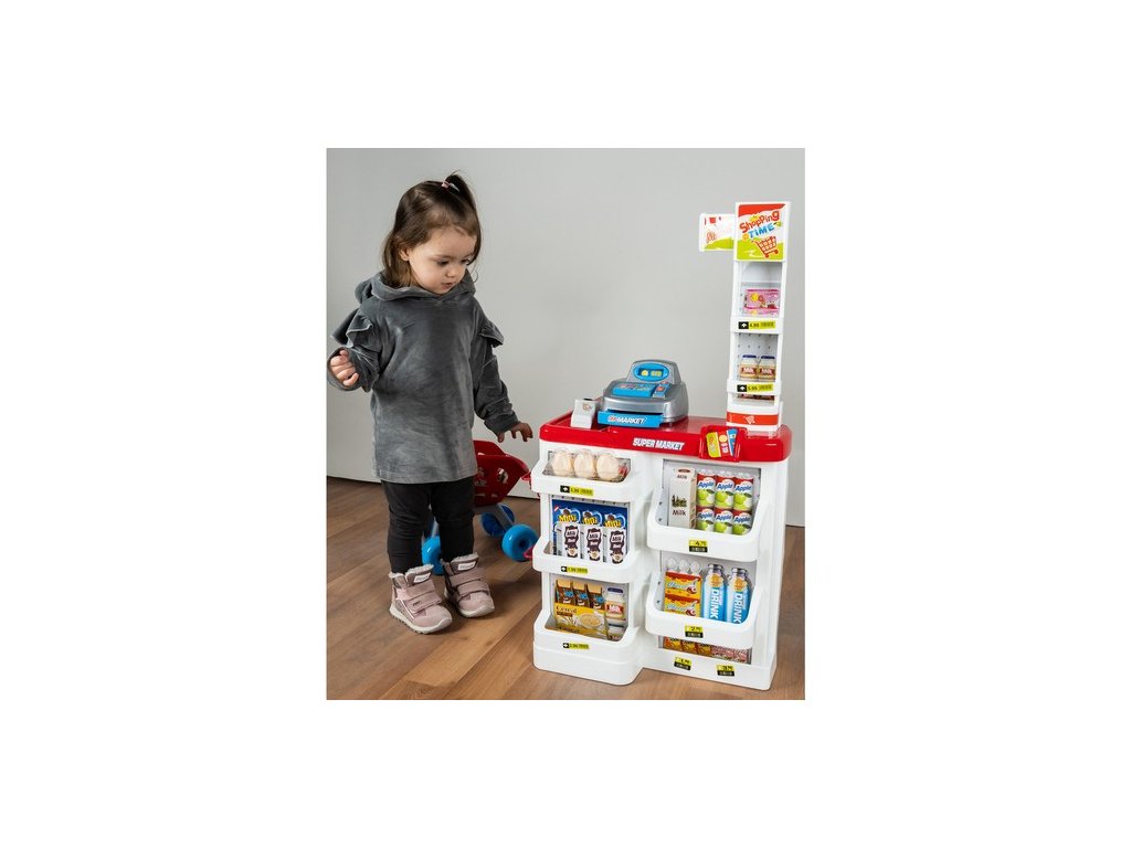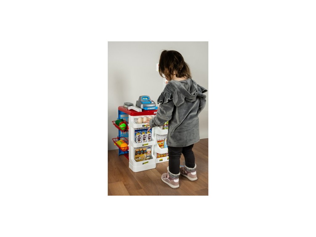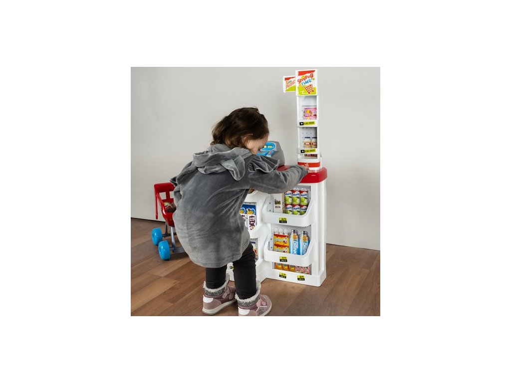 - KOMPLETNÍ HRACÍ SET - obsahuje pokladnu s váhou a prodejním pultem, umělé peníze a produkty umístěné na mnoha policích a regálech a také nákupní košík, který umožňuje okamžitou a zajímavou hru.