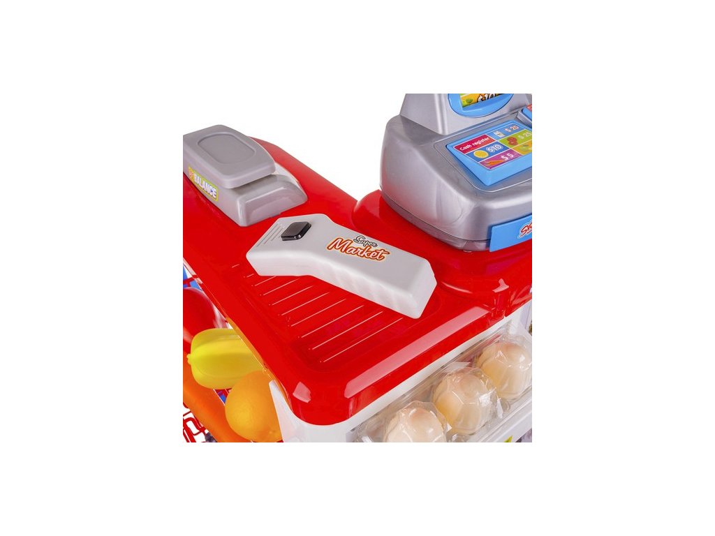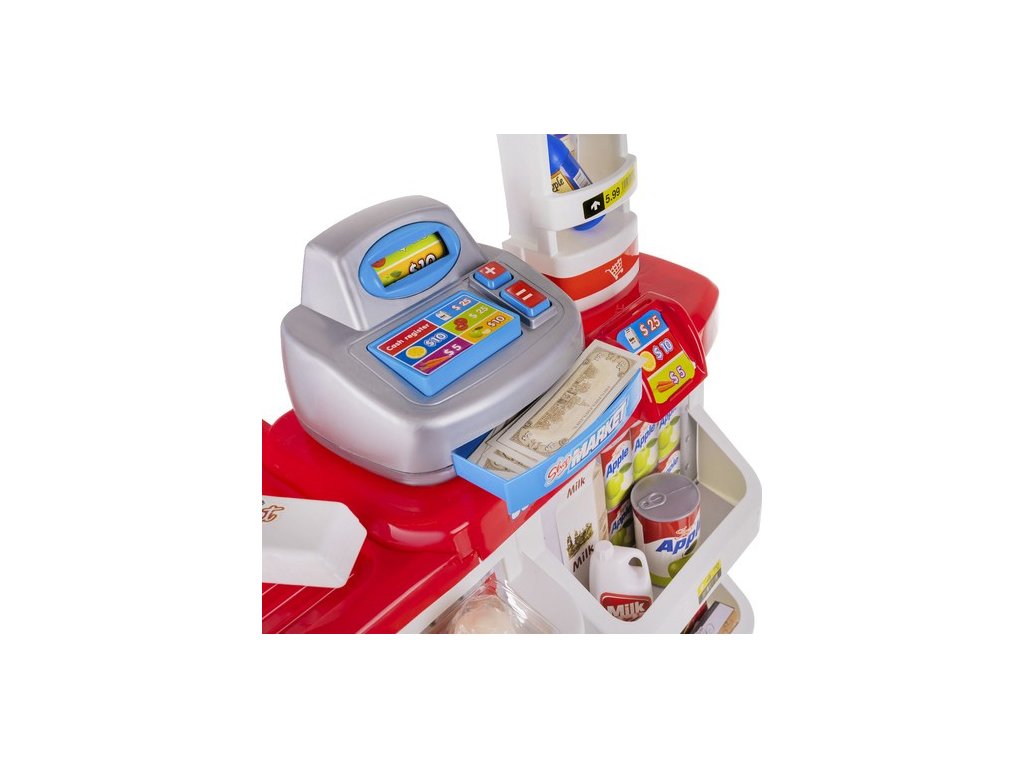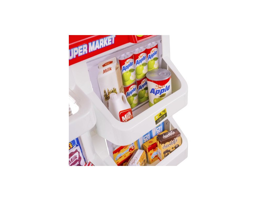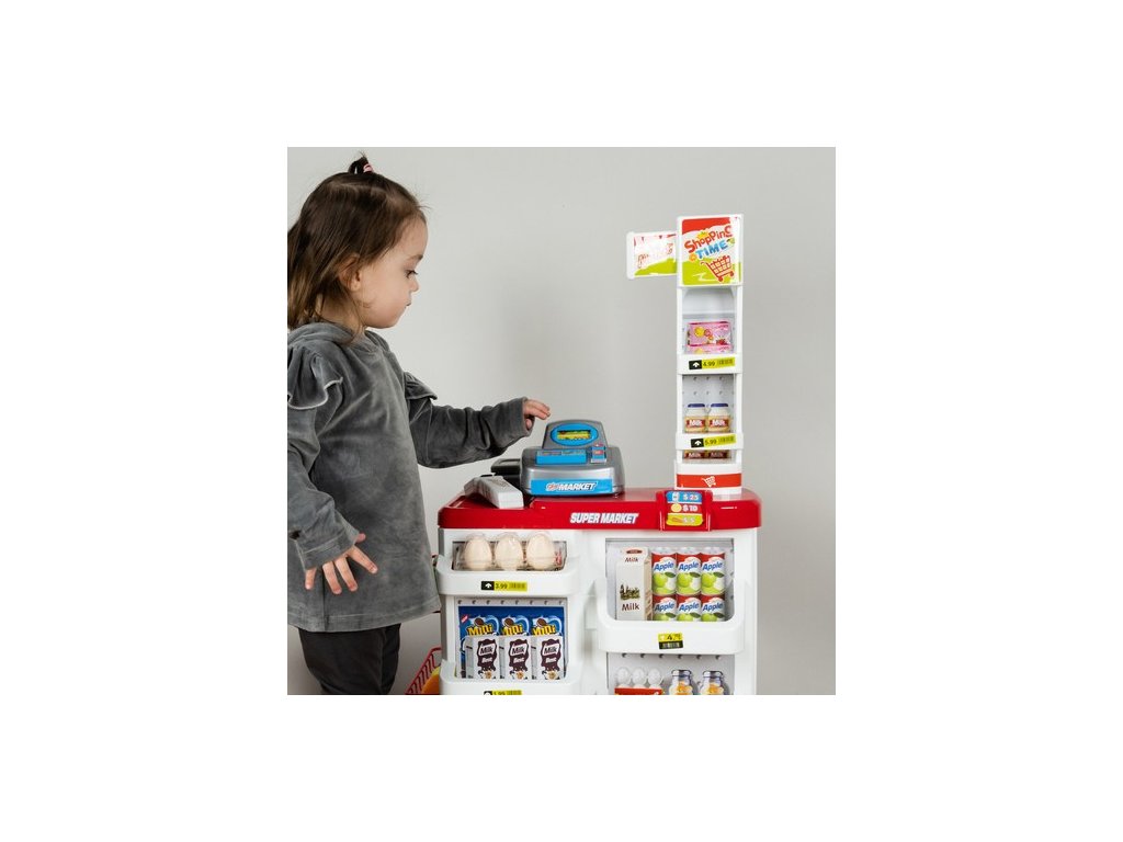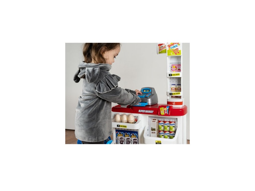 - KOMPLETNÍ HRACÍ SET - obsahuje pokladnu s váhou a prodejním pultem, umělé peníze a produkty umístěné na mnoha policích a regálech a také nákupní košík, který umožňuje okamžitou a zajímavou hru.