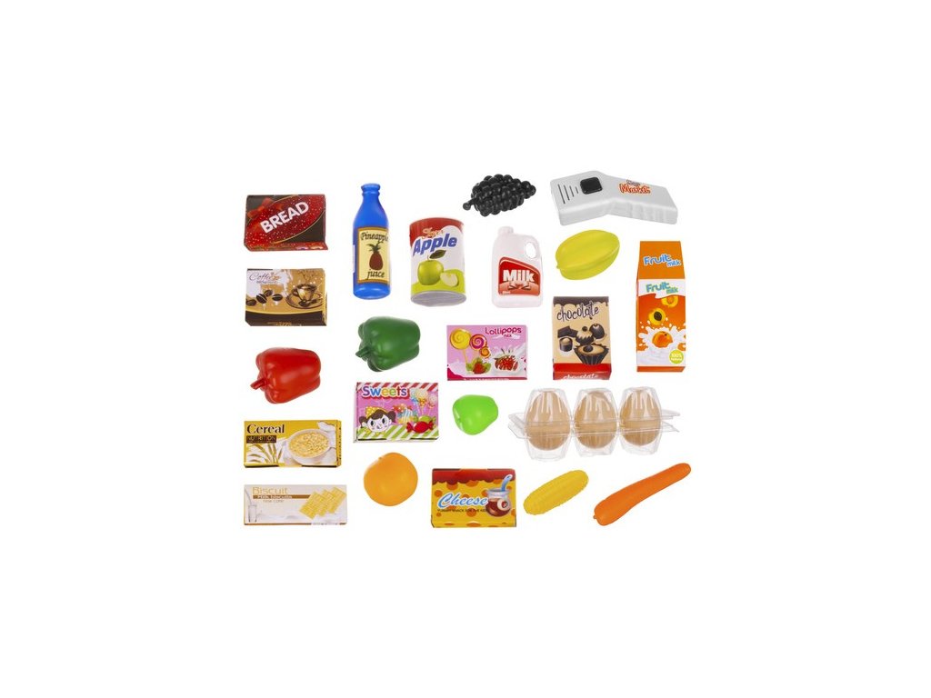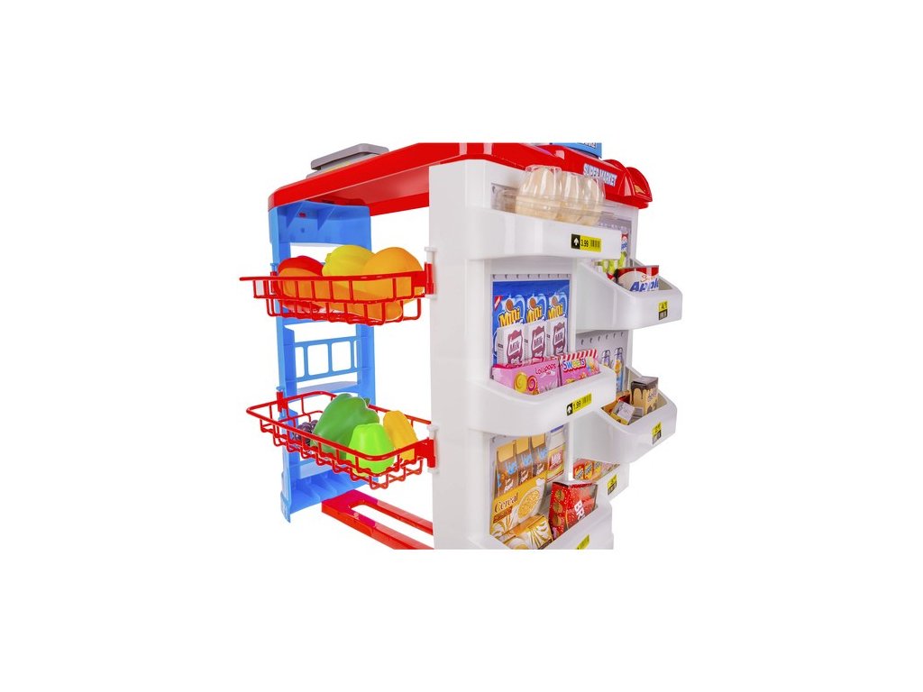 - SKUTEČNĚ VYPADAJÍCÍ PRODUKTY + VOZÍK – veškeré vybavení a produkty supermarketů jsou vícebarevné a atraktivně napodobují skutečný interiér prodejny ; zboží lze umístit na regály obchodů a umístit do přiloženého vozíku.