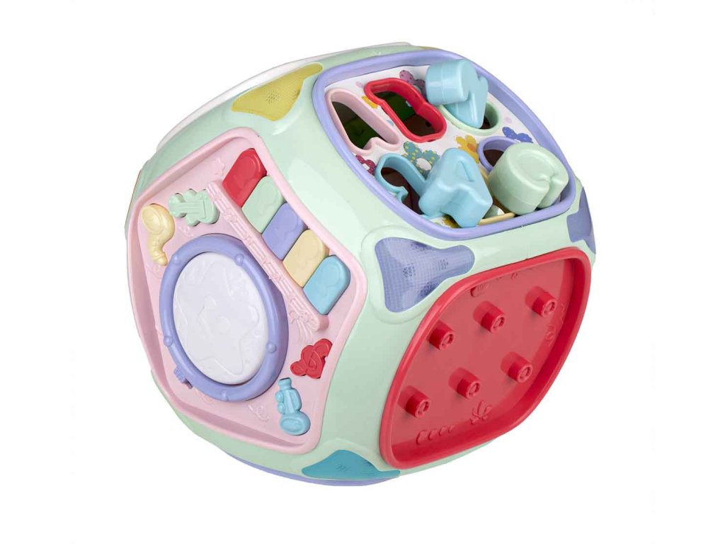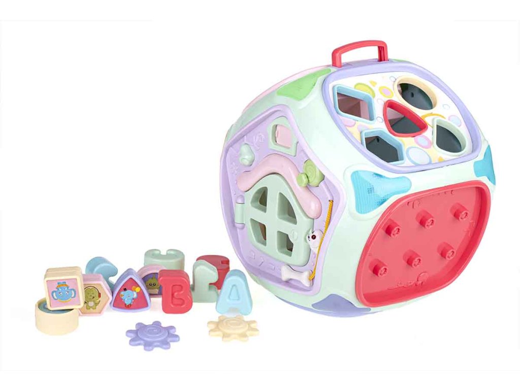 Hračka má mnoho stěn s mnoha různými hrami. Moderní pastelové barvy odlišují hračku od konkurence.