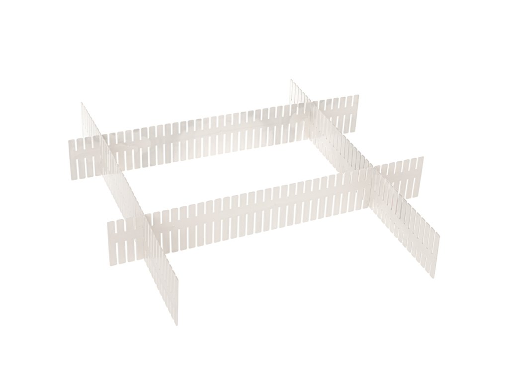 Vysoce kvalitní plast zaručuje dlouhou životnost výrobku. Četné zářezy zajišťují stabilitu konstrukce. Snadné přizpůsobení přepážek vašim potřebám vám dává možnost vytvořit nové uspořádání přepážek nebo je znovu použít v jiném prostoru.