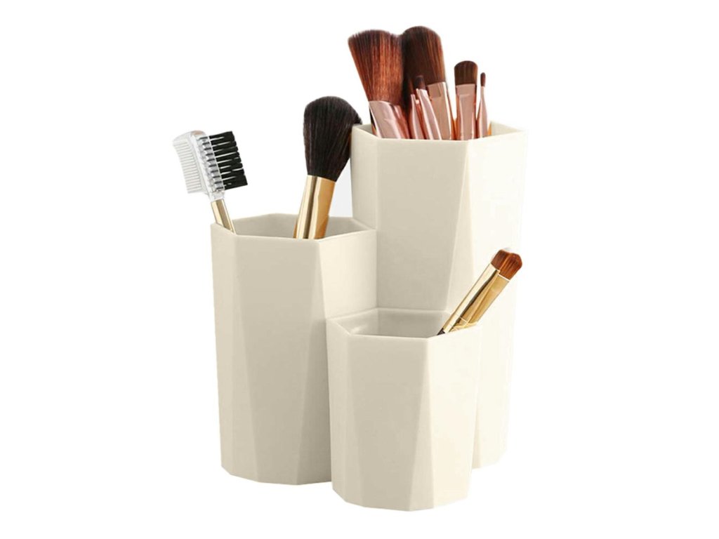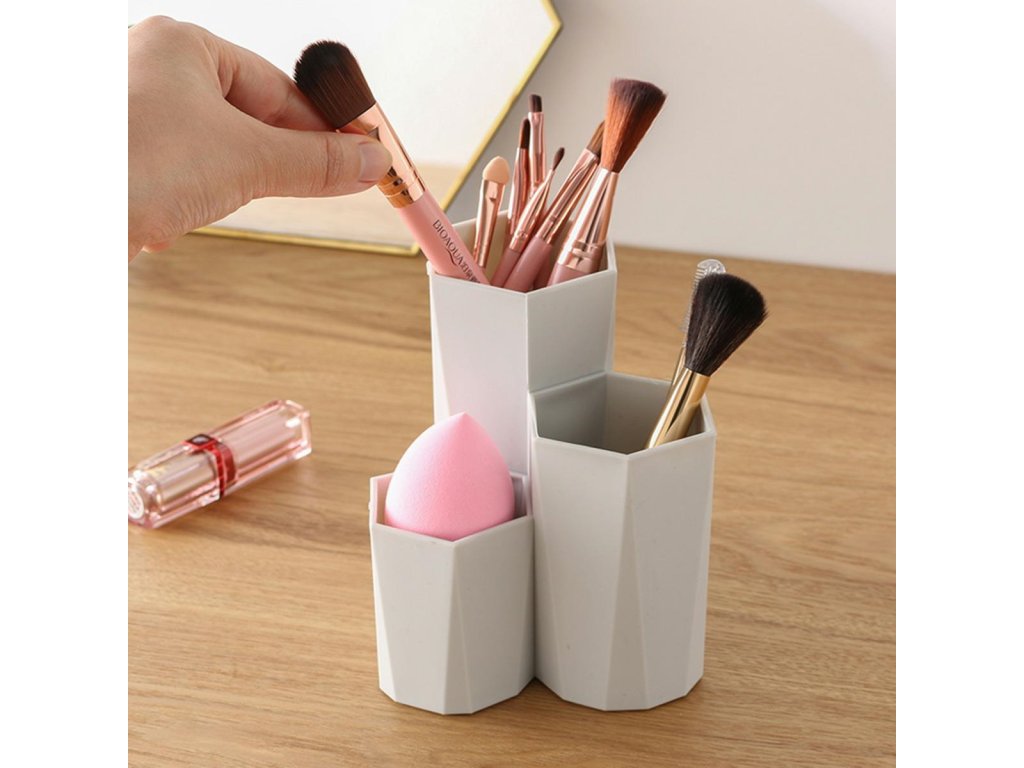 Mimořádně praktický organizér na štětce a kosmetiku se třemi samostatnými přihrádkami. Nádoba je ideální pro uložení kosmetických doplňků, které vám dříve ležely v kabelce nebo na vašem stole. Díky svému univerzálnímu designu zapadne organizér do interiéru každé místnosti. Udělejte si pořádek ještě dnes.